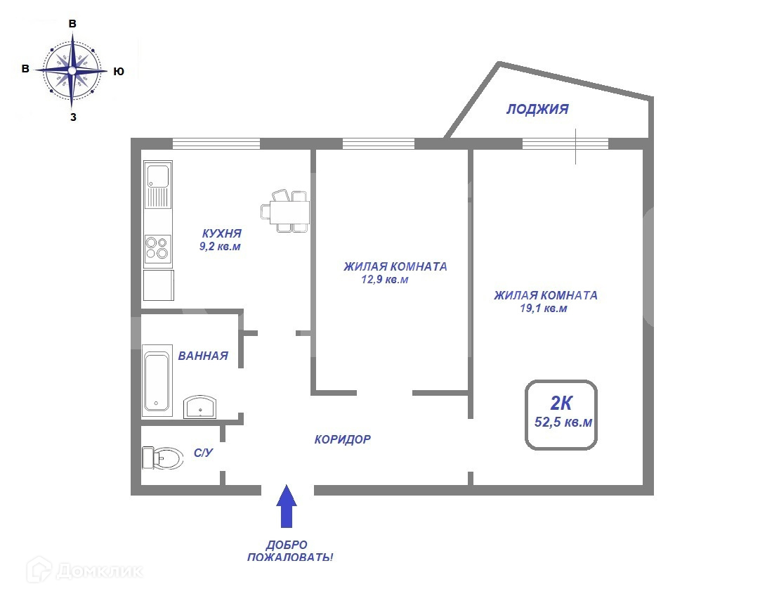 Общая площадь 52.5 м2