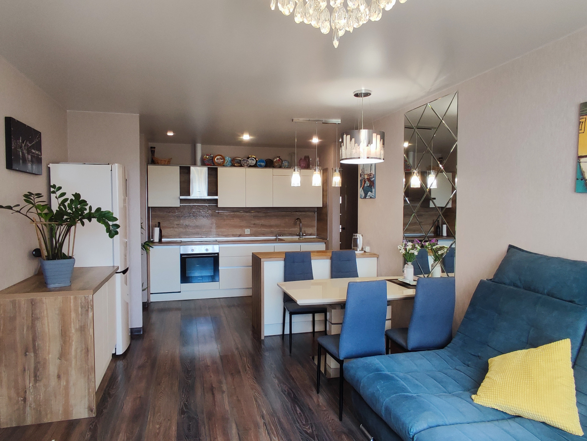 Комфортная квартира евро-формата: 3 комнаты и кухня-гостиная в ЖК Ударник. Продуманная планировка квартиры разделяет детские комнаты 16кв.м. и 14кв.м. от приватной зоны спальни 14 кв.м. за счет просторной кухни-гостиной 25 кв.м. Окна квартиры и балкон выходят во двор, из гостиной открывается замечательный вид на лес и красивые закаты. Квартира располагается в удалении от лифта, на этаже всего четыре квартиры, спокойные соседи. В квартире произведена перепланировка (узаконена), заменены все стеклопакеты и фурнитура на Rehau, установлены новые радиаторы Buderus с термоголовками Danfoss. В ванной уложен теплый пол под плитку с жк-терморегулятором для комфорта в межсезонье. В санузле подключен водонагреватель Ariston 80л из нерж. стали над стиральной машиной в шкафу-купе, что позволяет всегда быть с горячей водой. Шкаф-купе так же является зоной для хранения бытовых и хоз средств. Оба санузла оборудованы исталляциями для унитаза и смесителями Grohe. В комнатах установлены натяжные потолки, сделано освещение для зонирования обеденной зоны, зоны кухни и зоны гостиной. В спальне оборудован гардероб с местами для хранения вещей, гладильной доски и т.д. В прихожей грязная зона отделена от жилой зоны напольной плиткой, размер прихожей позволяет разместить для хранения велосипеды, самокаты или снегокаты с зимним инвентарем. Установлен вместительный шкаф-купе. В одной из комнат так же установлен шкаф-купе для хранения, рабочая зона во всю ширину комнаты, что позволяет с комфортом заниматься учебой/работой. В кухне-гостинной установлен кухонный гарнитур, остров со встроенной СВЧ и отдельная зона для хранения с бутылочницей у холодильника. Фурнитура Blum, водостойкие столешницы Duropal, встроенная техника Hansa. Кухня оборудована смесителем 2 в 1 с подключеной 3х ступенчатой системой очистки воды. Дом комфорт-класса на охраняемой территории, закрытый двор с игровыми комплексами для детей и взрослых. Развитая инфраструктура района - в шаговой доступности магазины, аптеки, медицинские центры, стоматологии, школа 113, гимназия-театр 205, садики, детская больница, вет. клиника, Парк Победы с беседками и мангальной зоной отдыха, ДК Уралмаш с детскими клубами и спортивными секциями. Остановка транспорта в пешей доступности. ЖК Ударник включает в себя подземный и наземный паркинг. Чистая продажа.