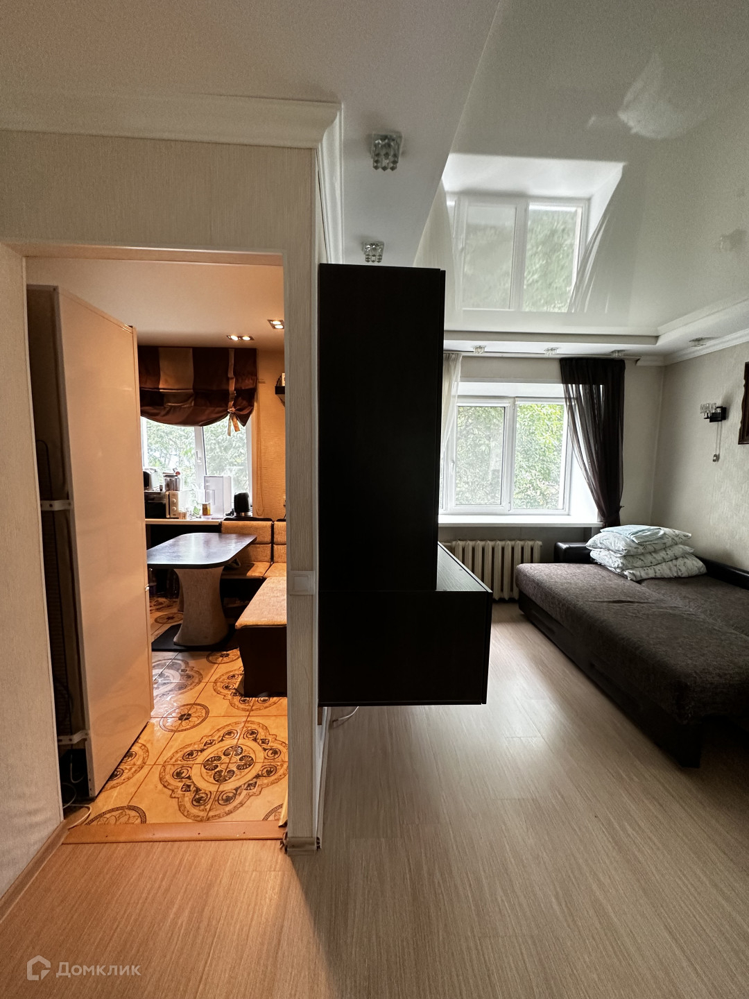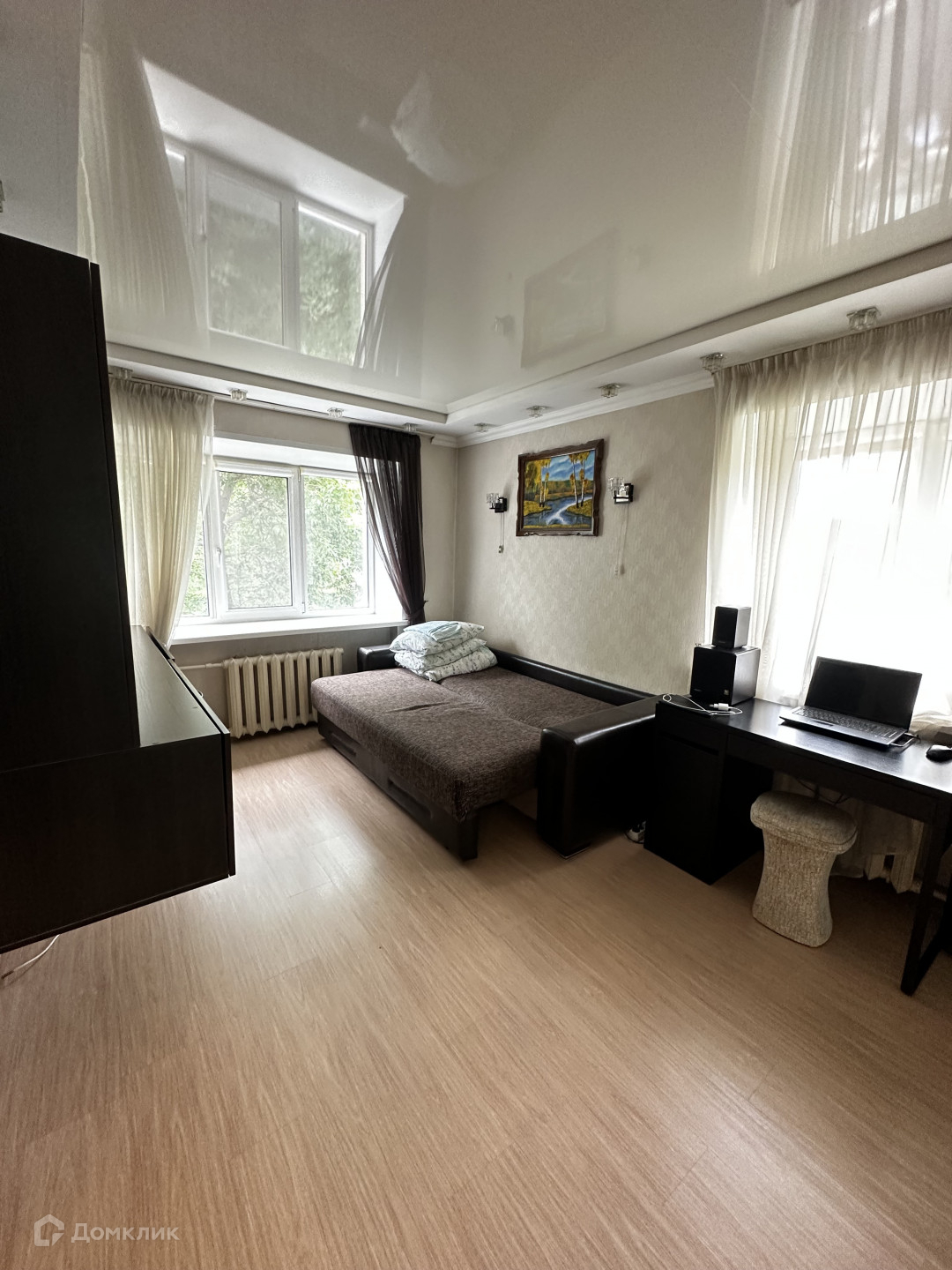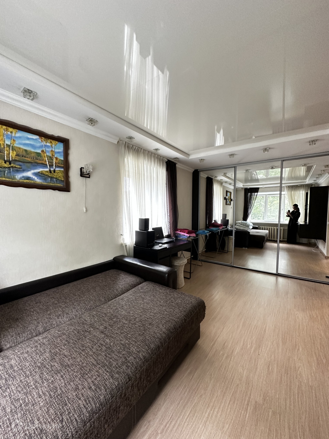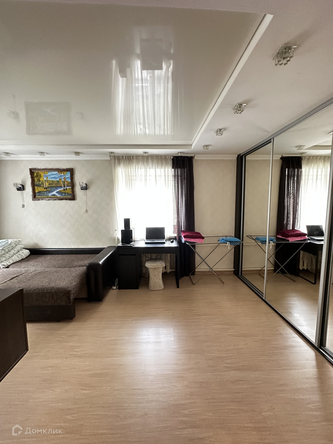 Во всей квартире- натяжные потолки, напольное покрытие -ламинат в комнате, в коридоре,