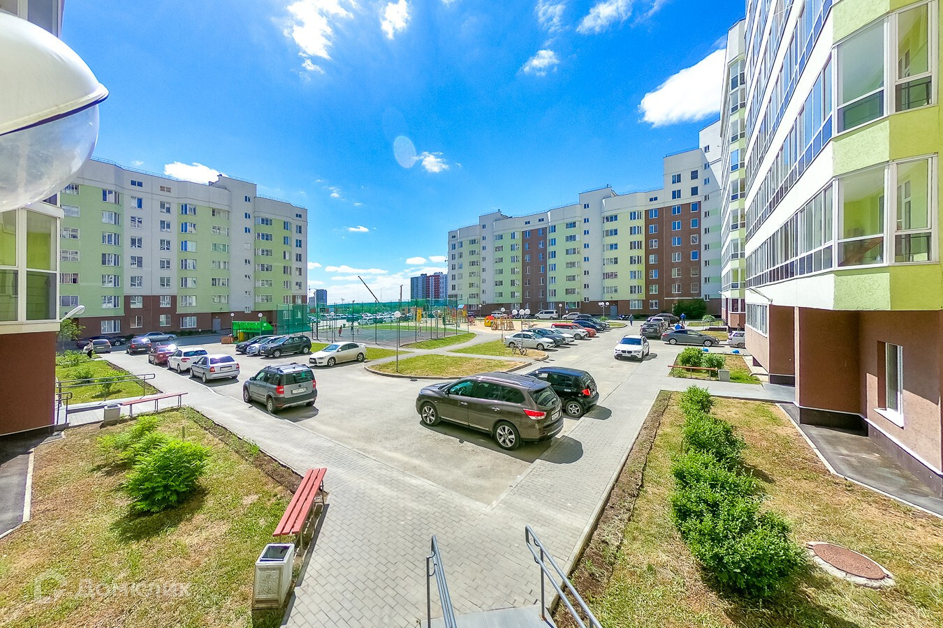 -Закрытая территория с воркаутом и огромной детской площадкой с песочным покрытием.