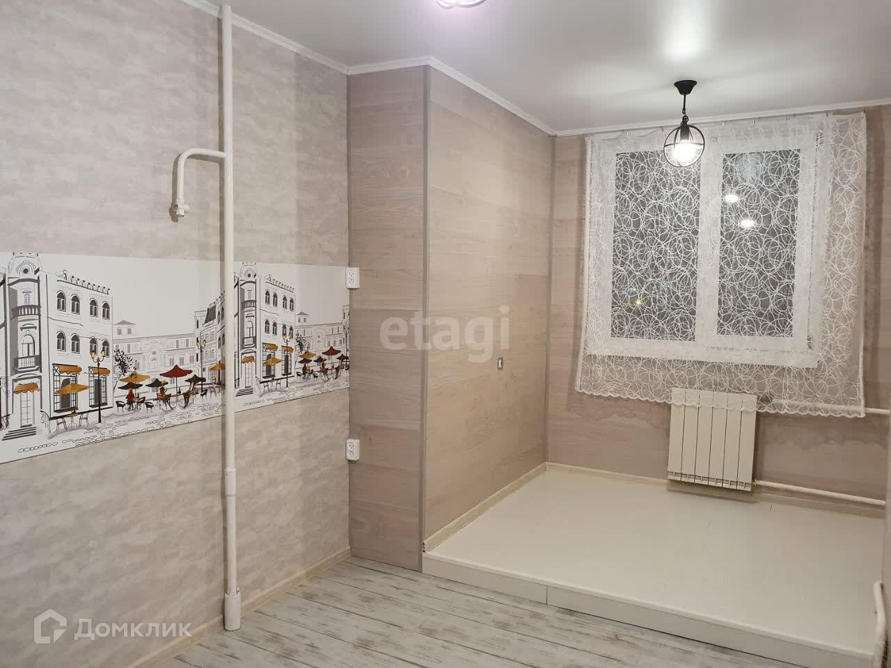 Сделан свежий ремонт. На стенах лаконичные обои, убраны старые полы и залита стяжка во всей квартире. На кухне и в коридоре положена плитка, в комнатах ламинат. В ванной сделан теплый пол. Все стояки и трубы поменяны.