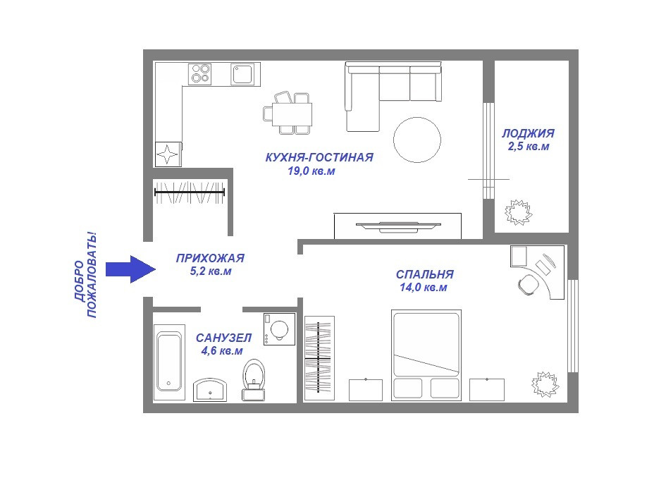 - Кухня-гостиная, спальня, совмещенный санузел, лоджия;