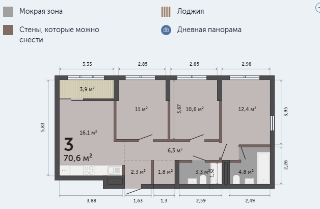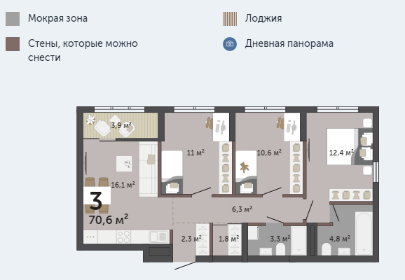 Общая площадь 70.6 м2