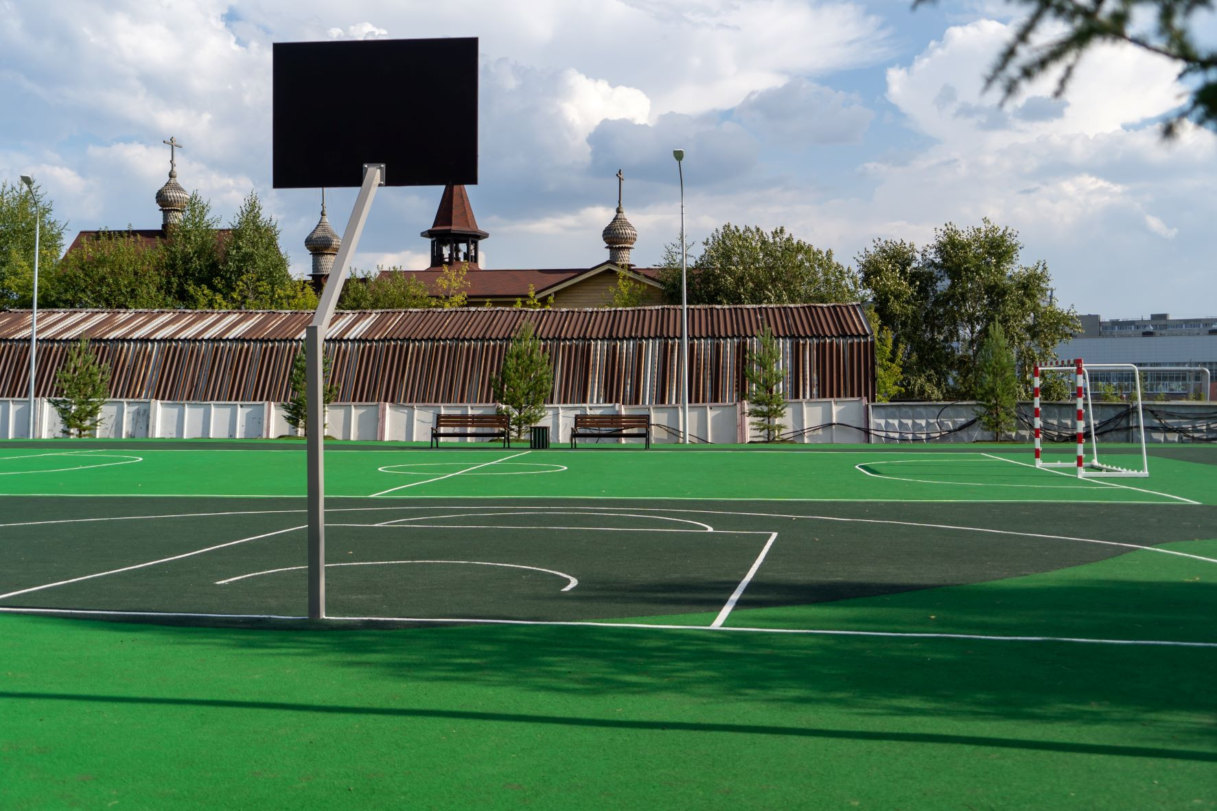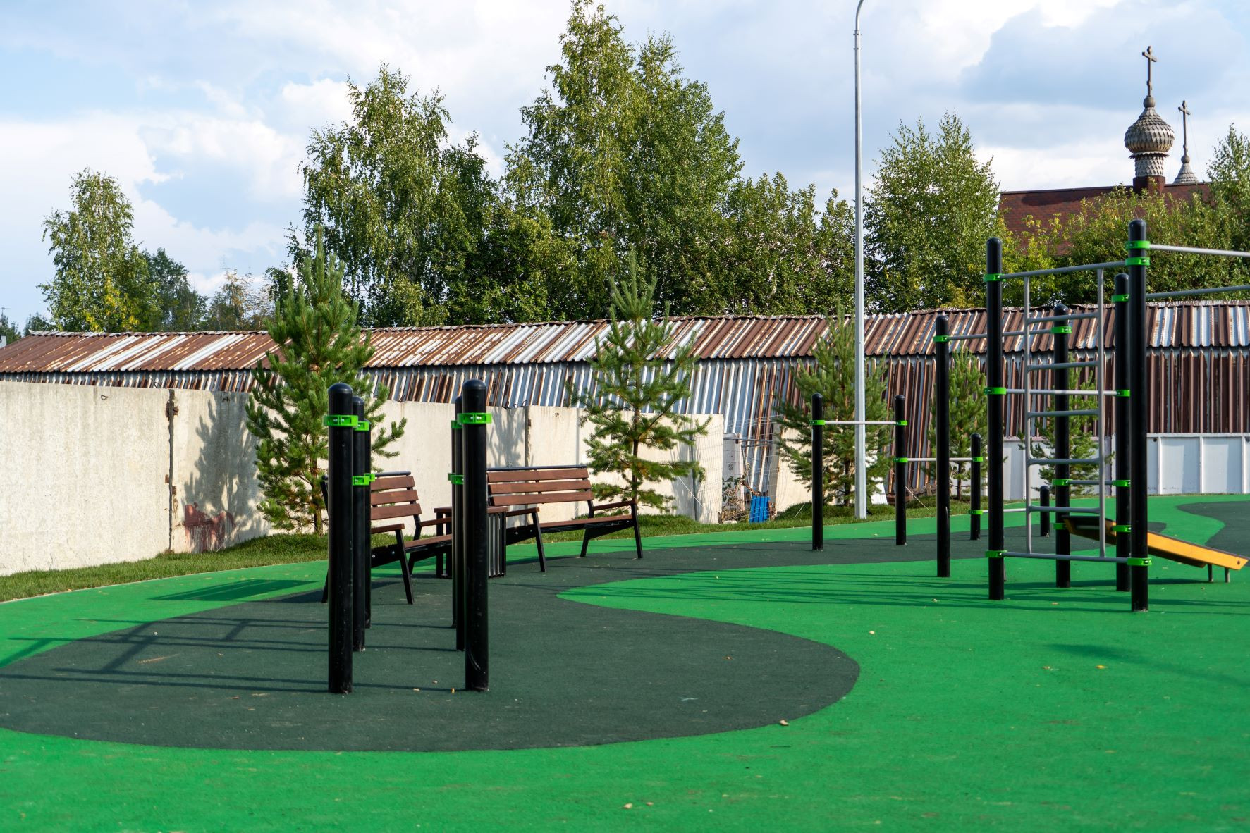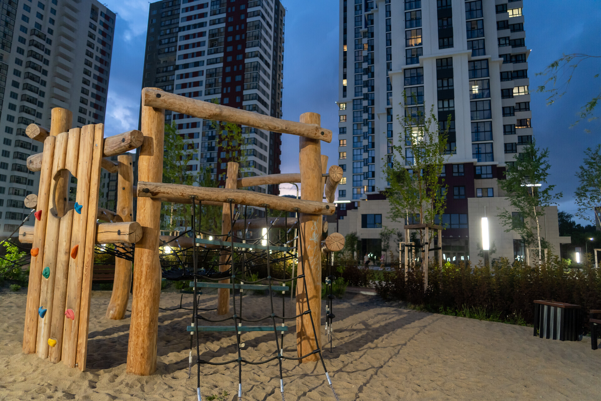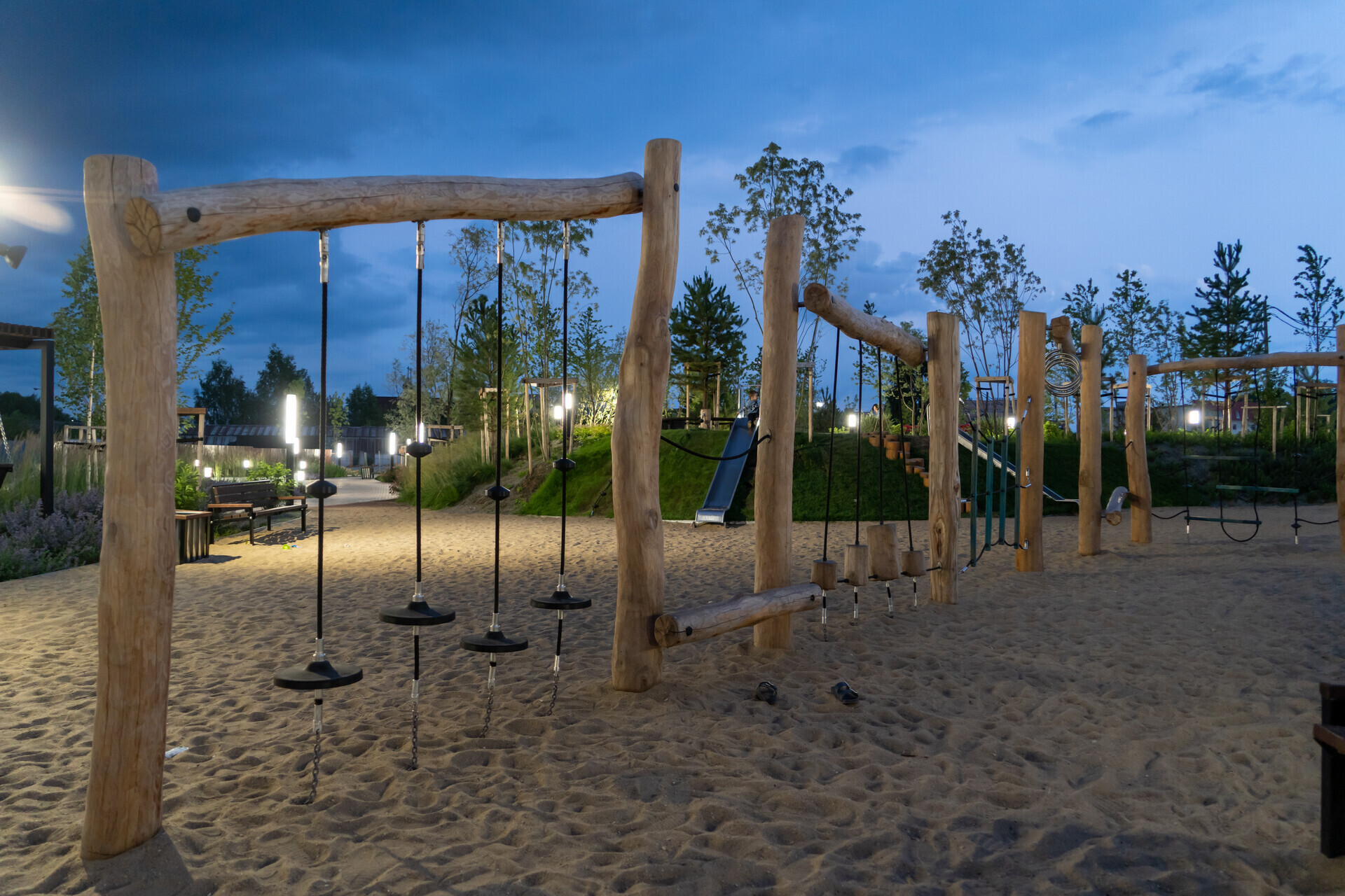В ландшафтном парке кроме детских площадок вас ждут спортплощадки для футбола и стритбола, воркаут-комплекс и даже крытый деревянный амфитеатр для праздников или отдыха в жаркую погоду. Но это не всё.
