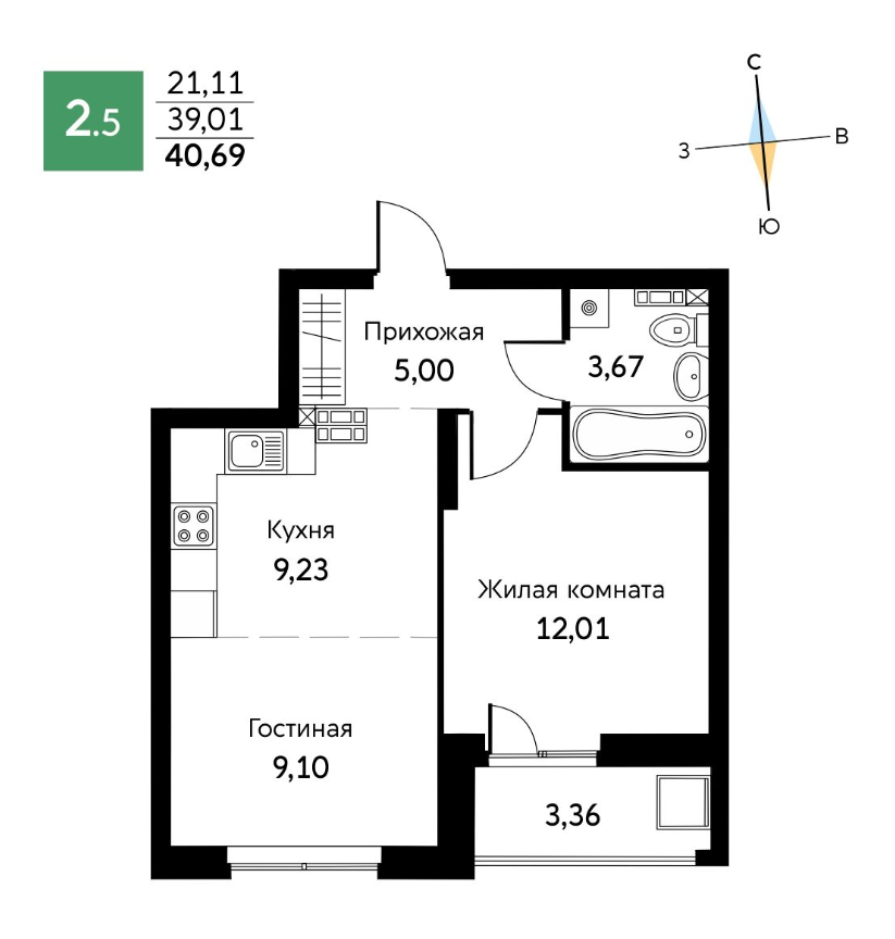 Общая площадь 40.69 м2