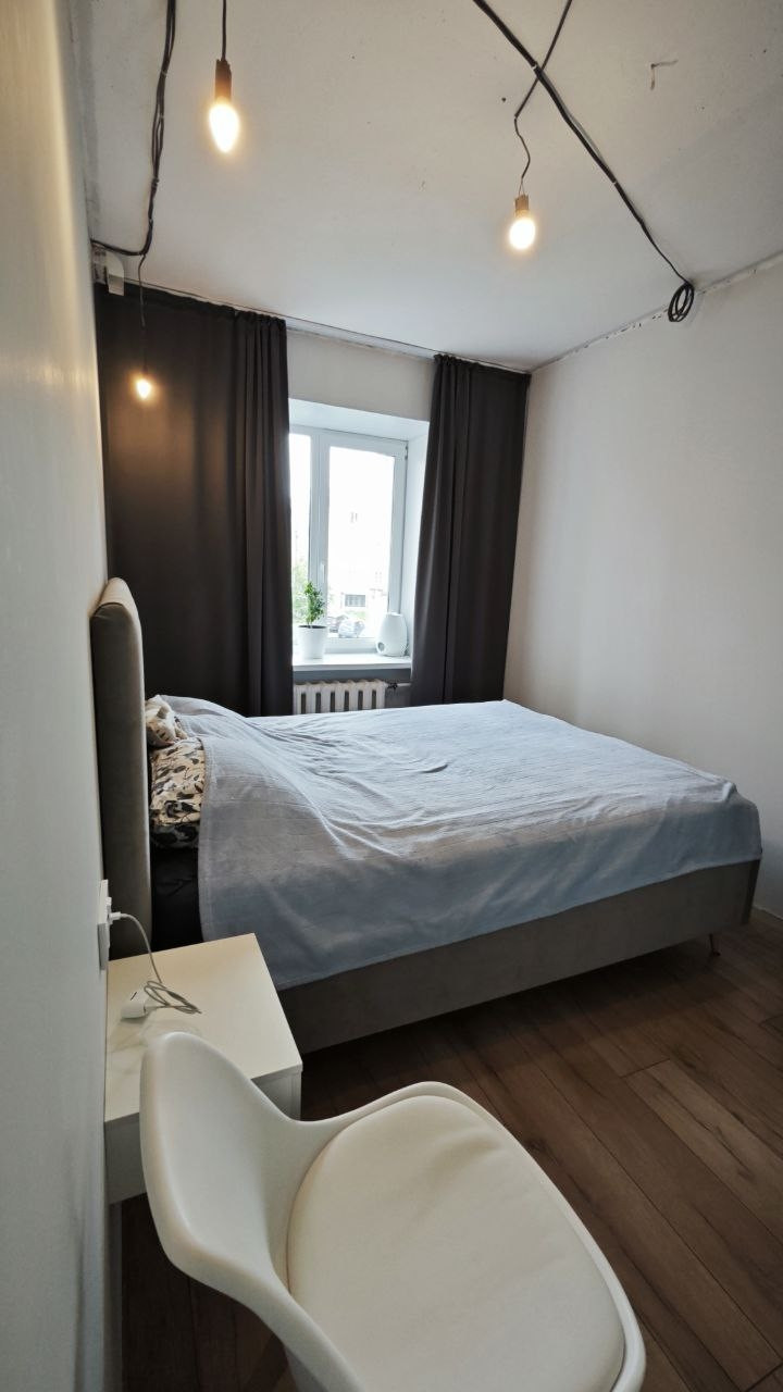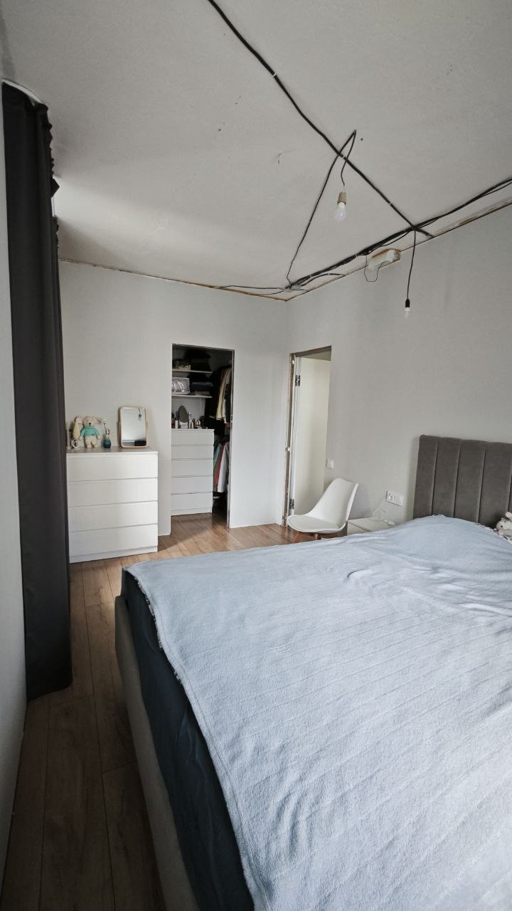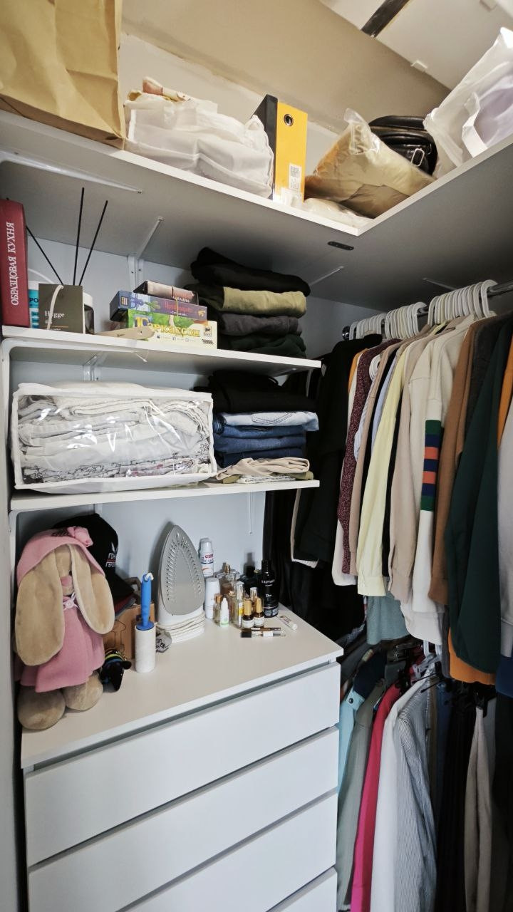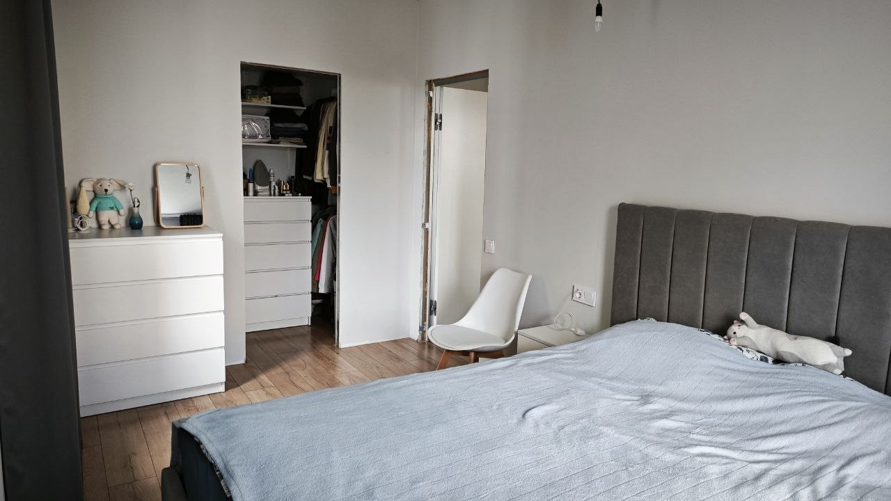В спальне: вместительная кладовая с комодом, полками и двумя штангами для одежды, подвесные прикроватный тумбочки, розетки с USB, проходные выключатели.