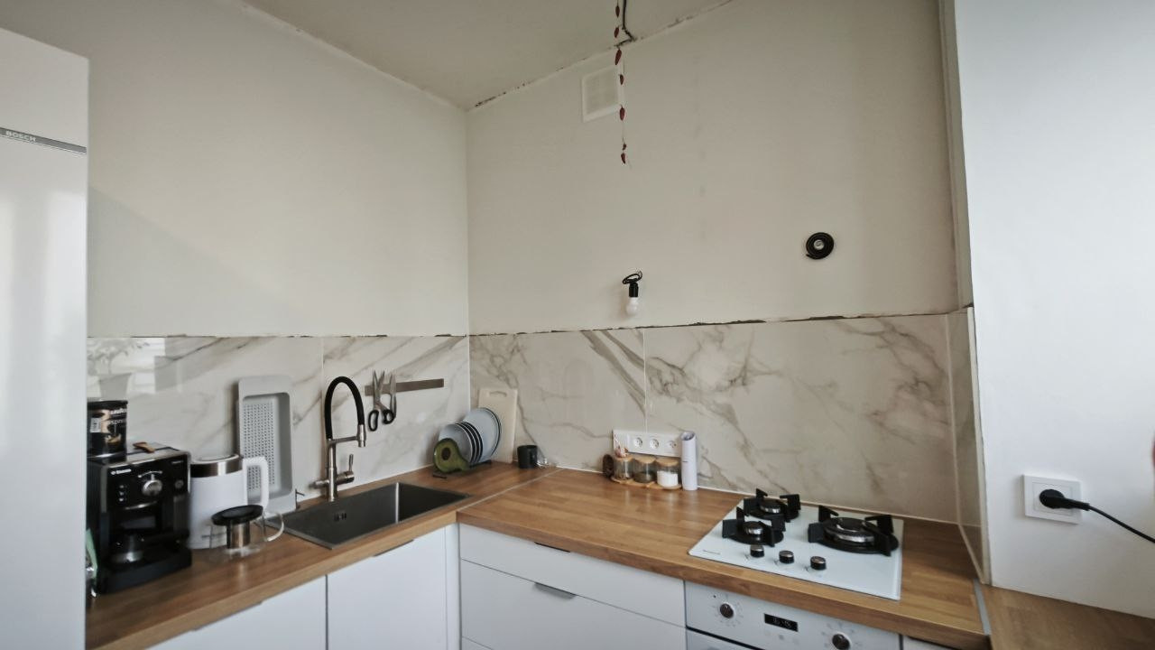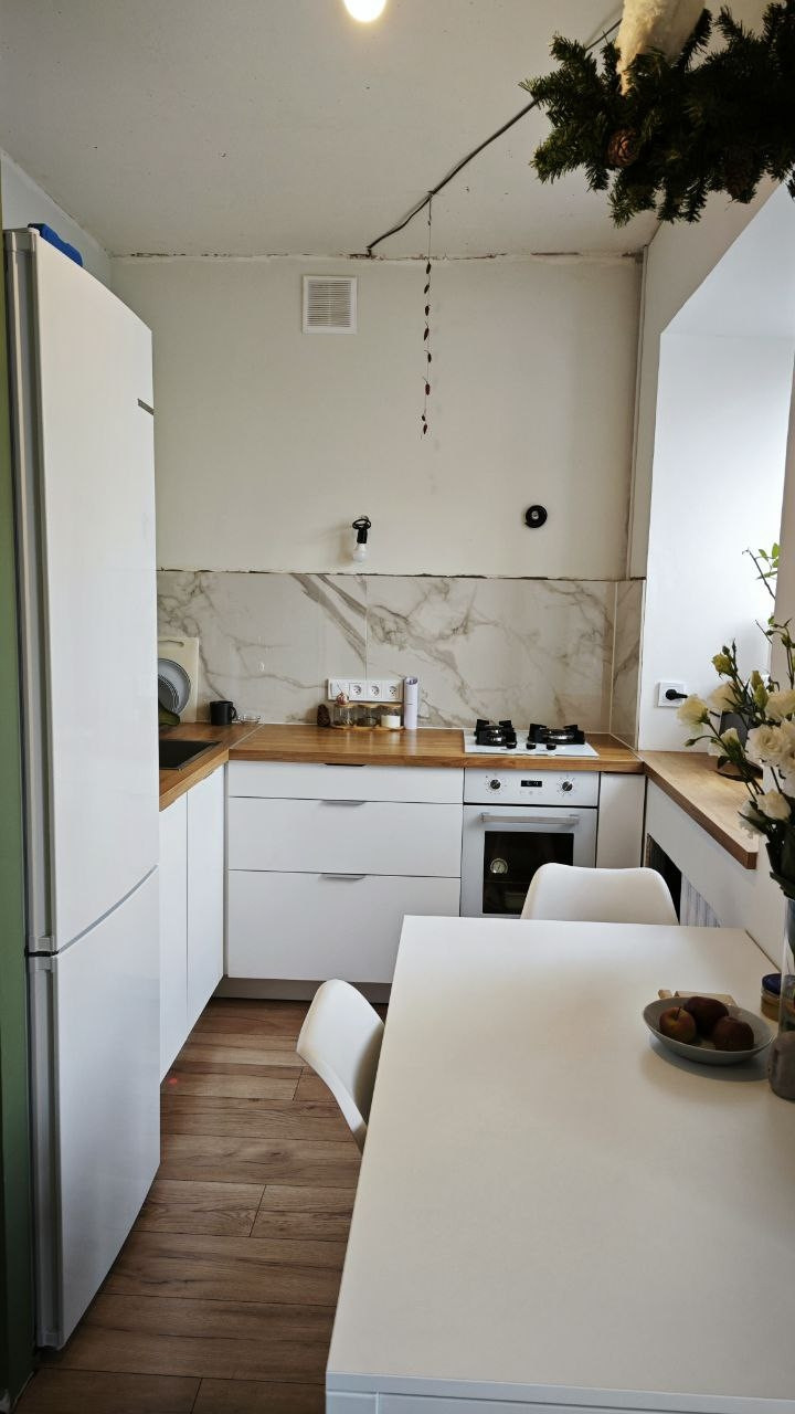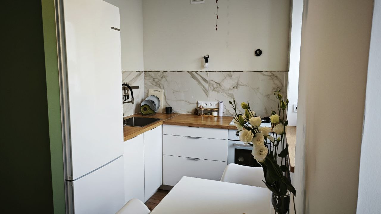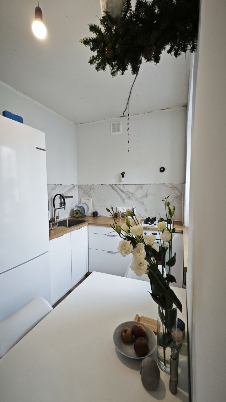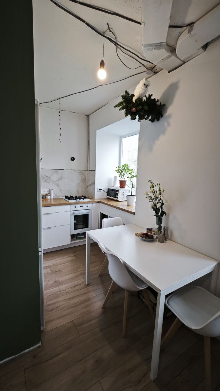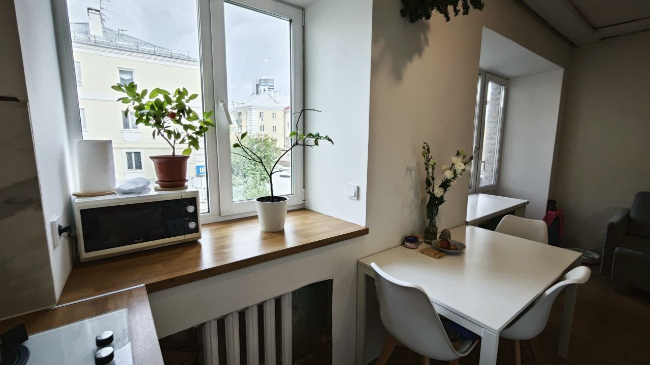 На кухне: новый гарнитур с духовкой и варочной панелью на 45см, большая раковина из нержавейки, фильтр для воды с осмосом (можно пить из крана), место под посудомойку, столешница объединена с подоконником.