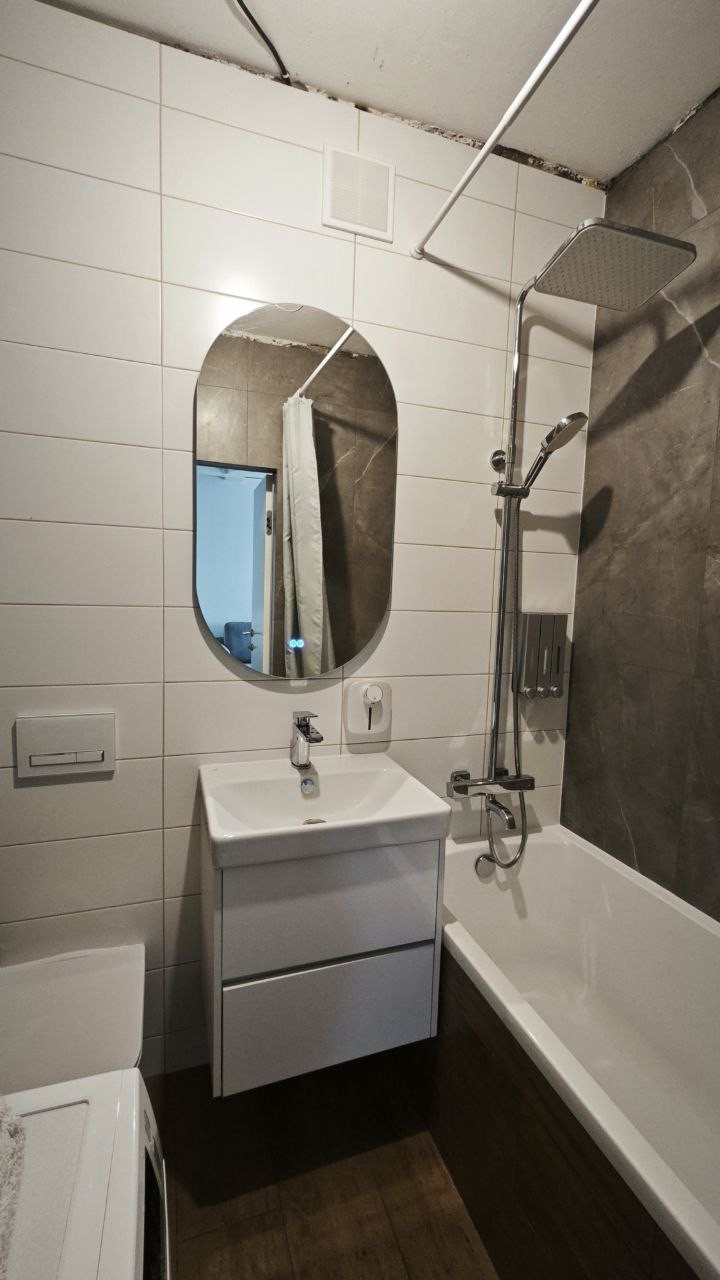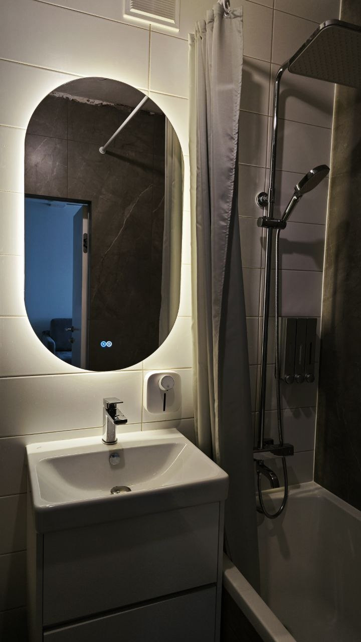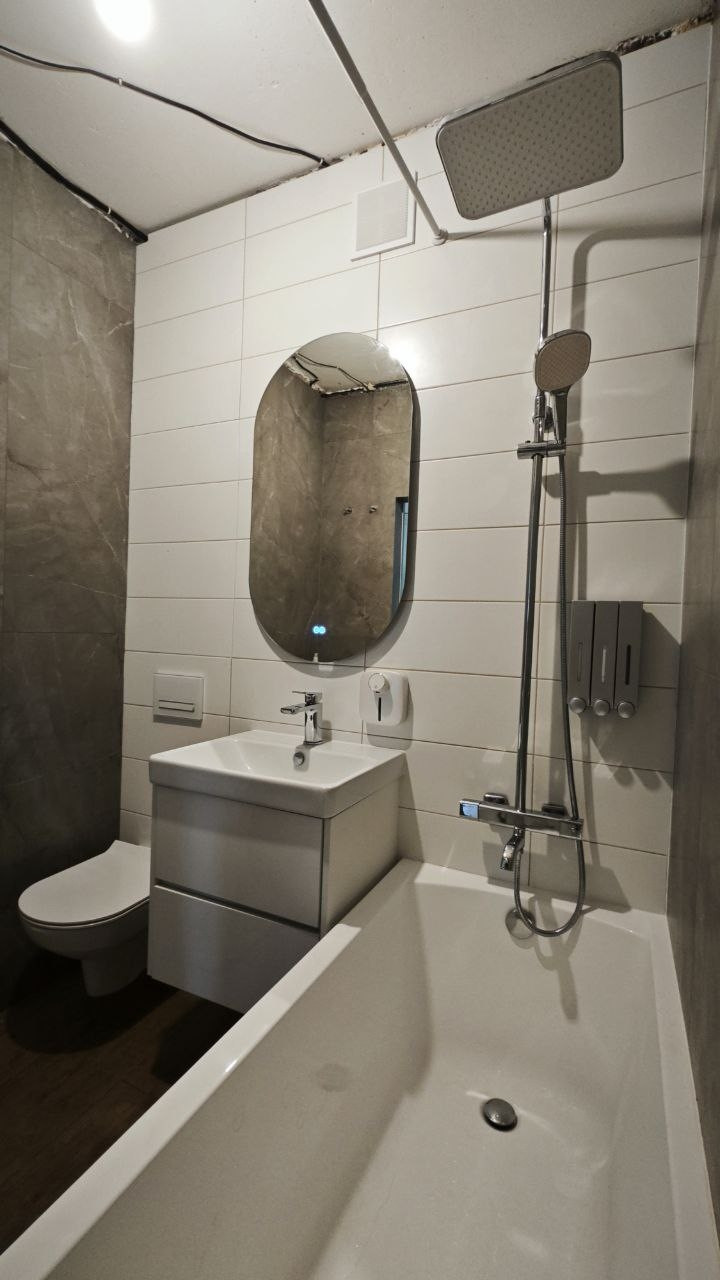 В санузле: установлены редукторы давления, магистральные фильтры воды, сделаны выводы под проточный водонагреватель, проведен тёплый пол, подвесной унитаз с инсталляцией, смеситель с тропическим душем и термостатом, подвесная тумба с раковиной, зеркало с подсветкой и подогревом.