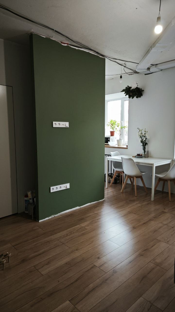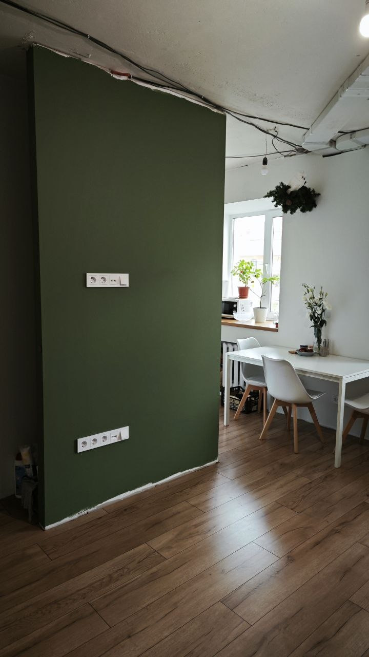 В гостиной: ниша под большой встроенный шкаф 2.5м, место под ТВ на 60 дюймов, место под диван до 2.3м.