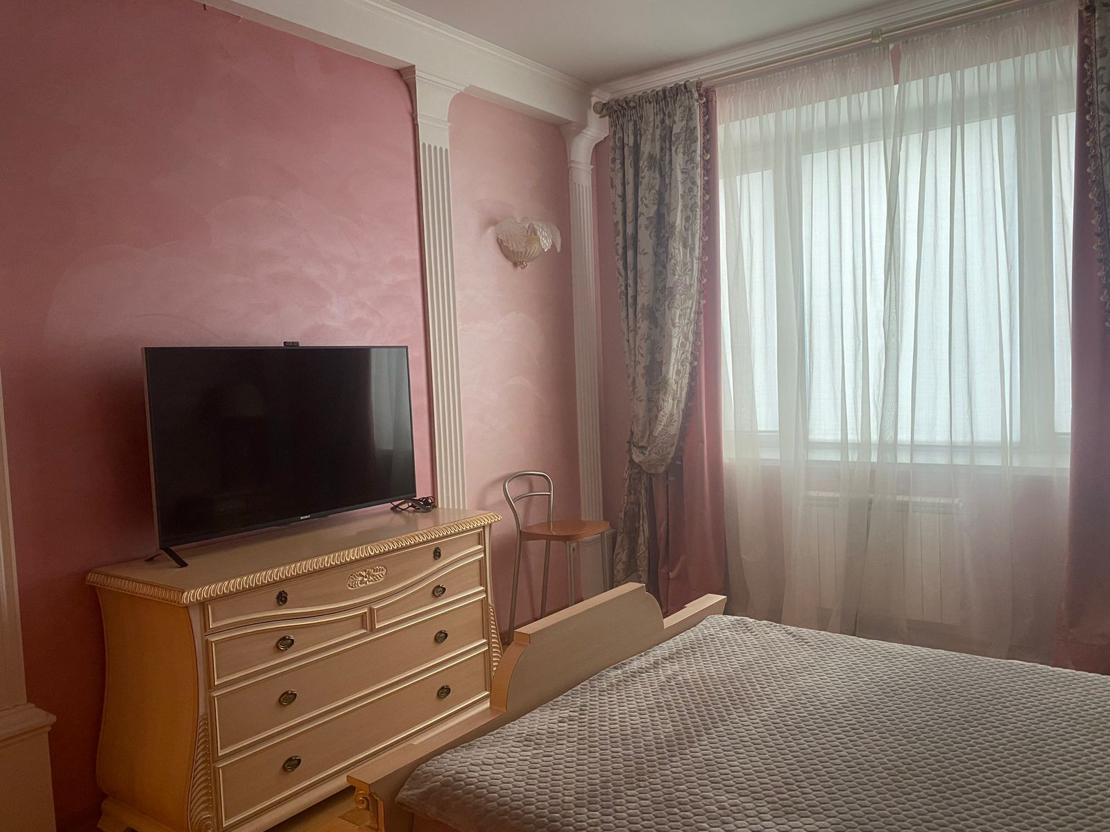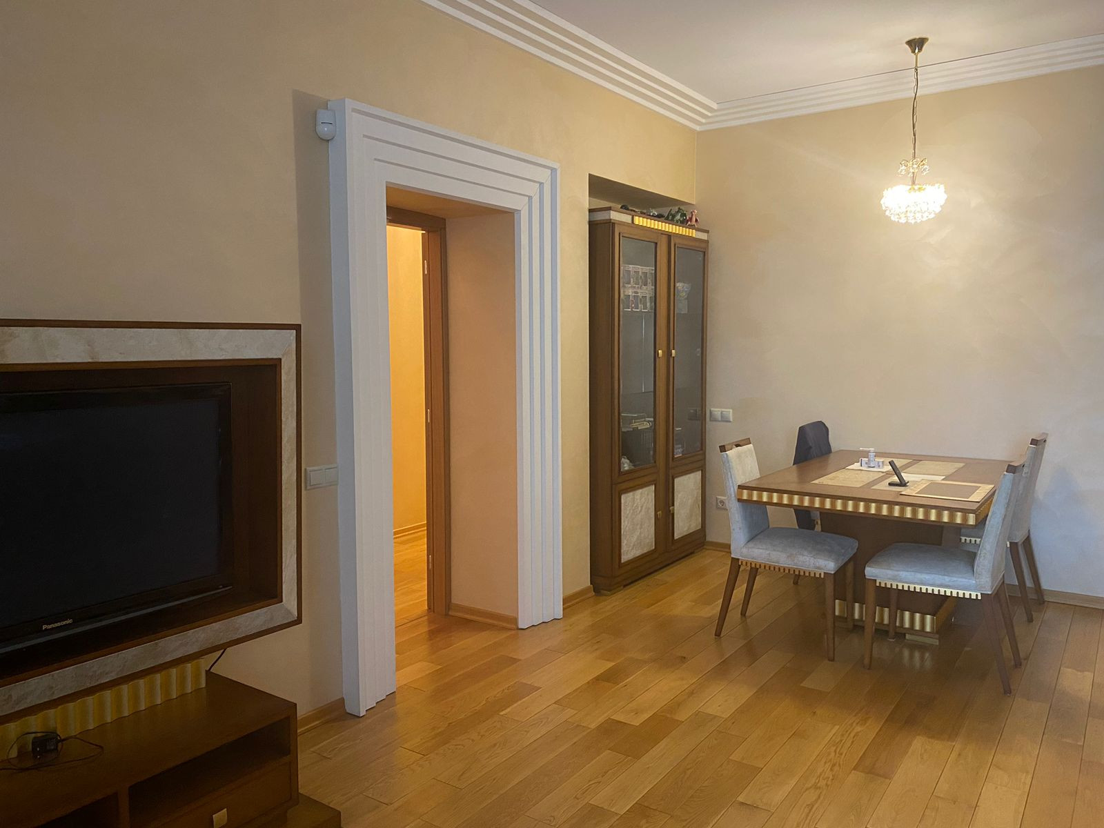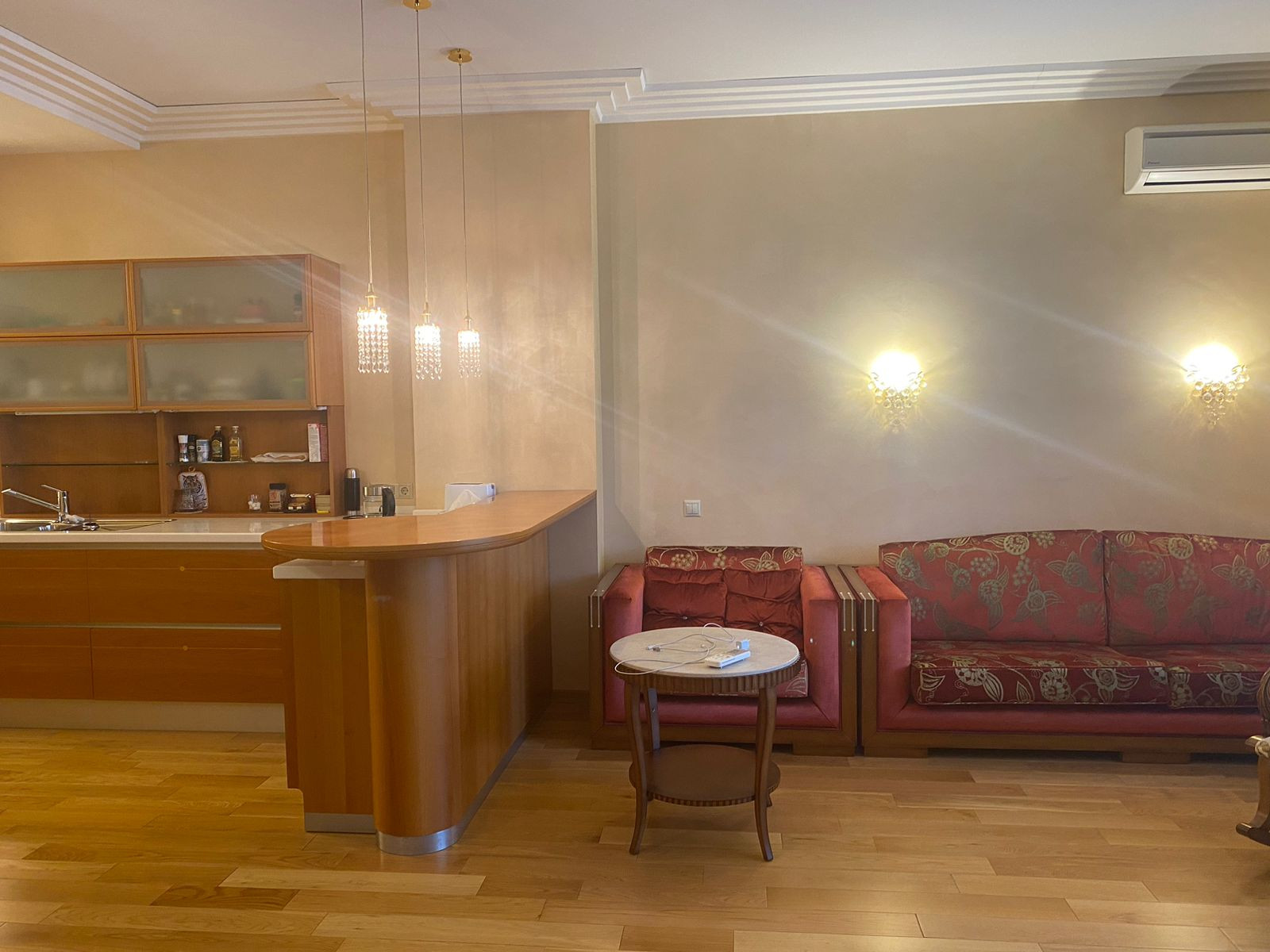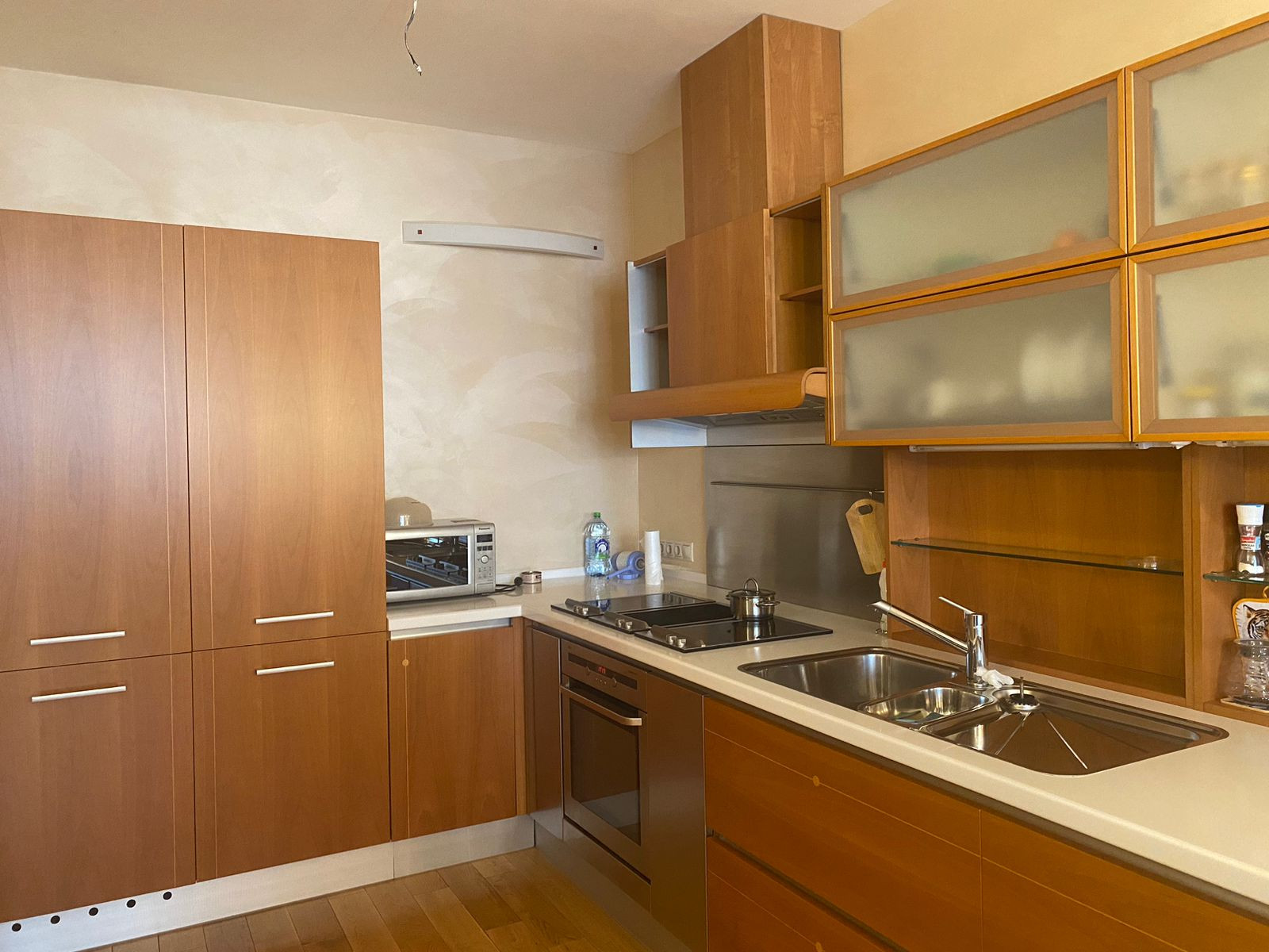 Гостевая комната совмещена с кухней и изолированная спальня, просторный коридор. Большой кухонный гарнитур со встроенной техникой производство Германии, холодильник, посудомойка, духовка, гриль, две оборудованные гардеробные.