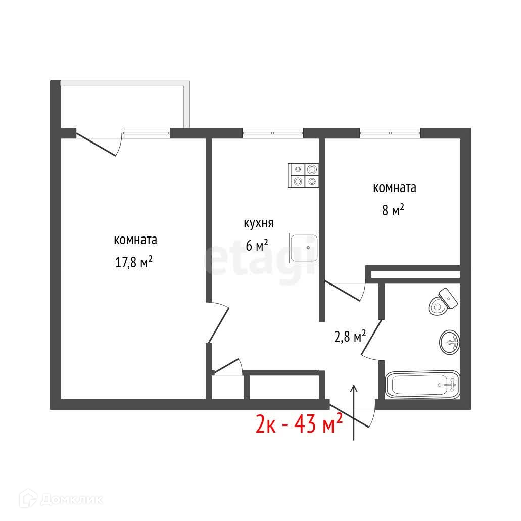 Общая площадь 43.5 м2