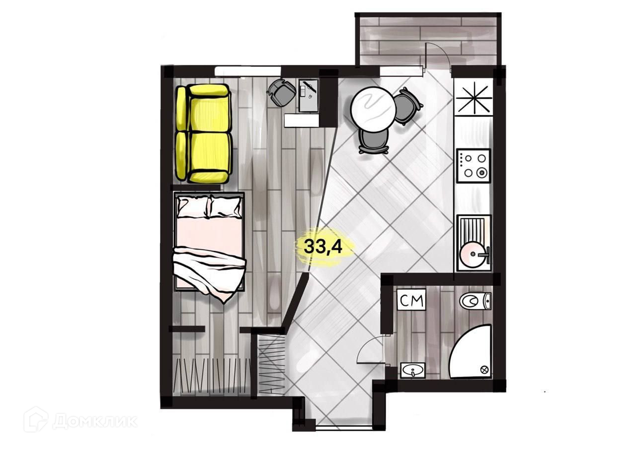Общая площадь 33.4 м2