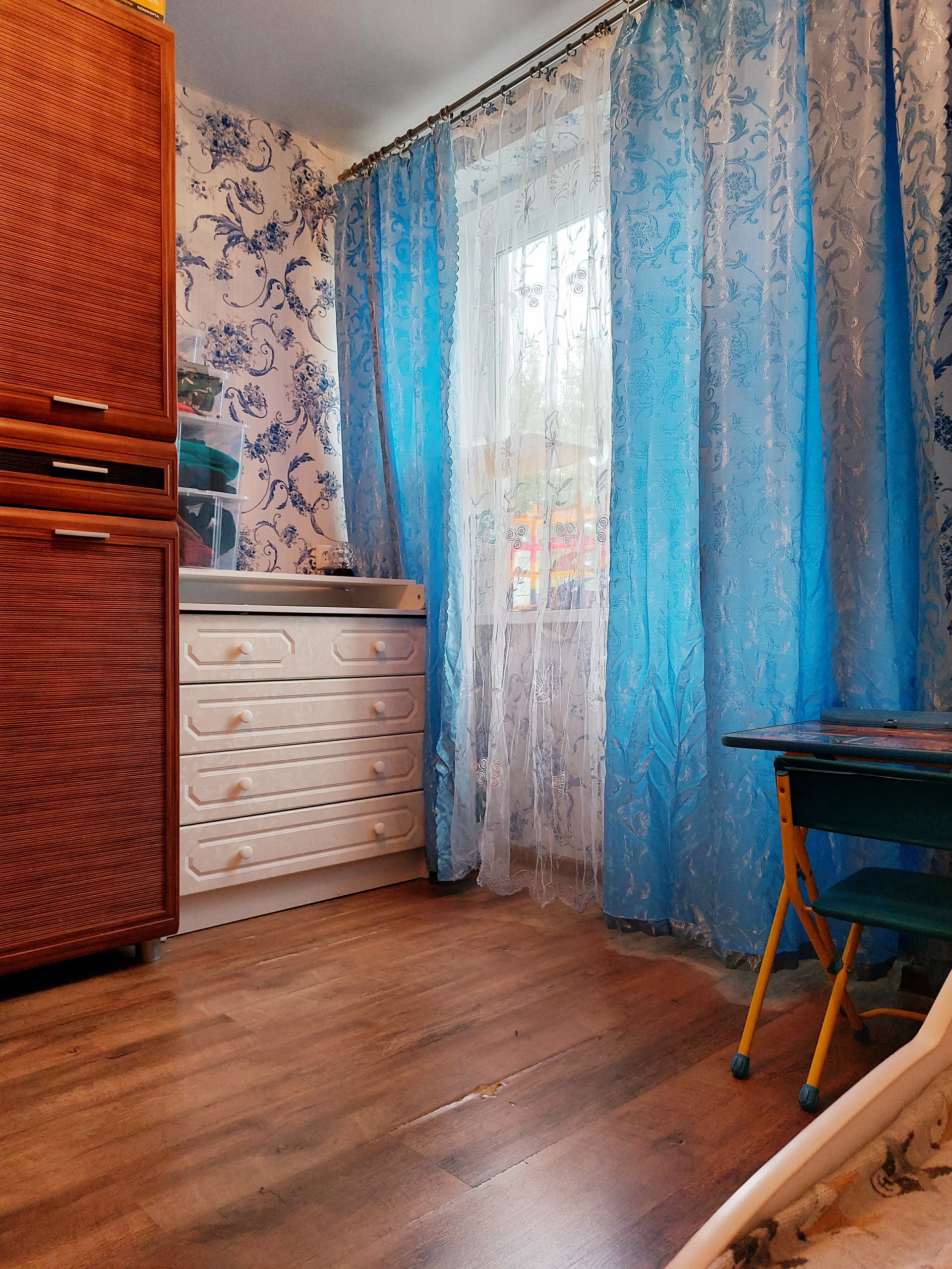 Сделана перепланировка - кухня соединена с большой комнатой, а на её месте сделана детская комната.