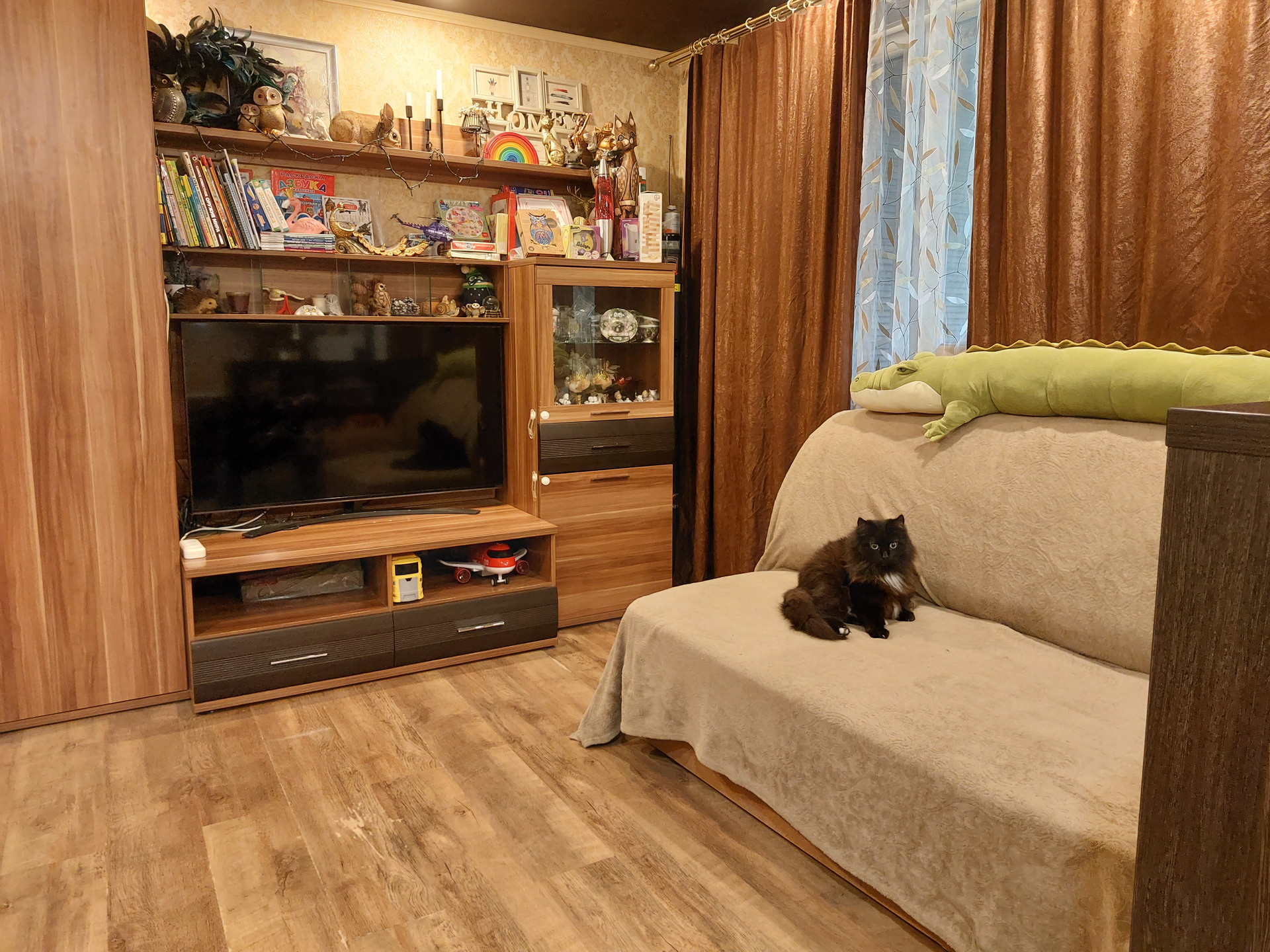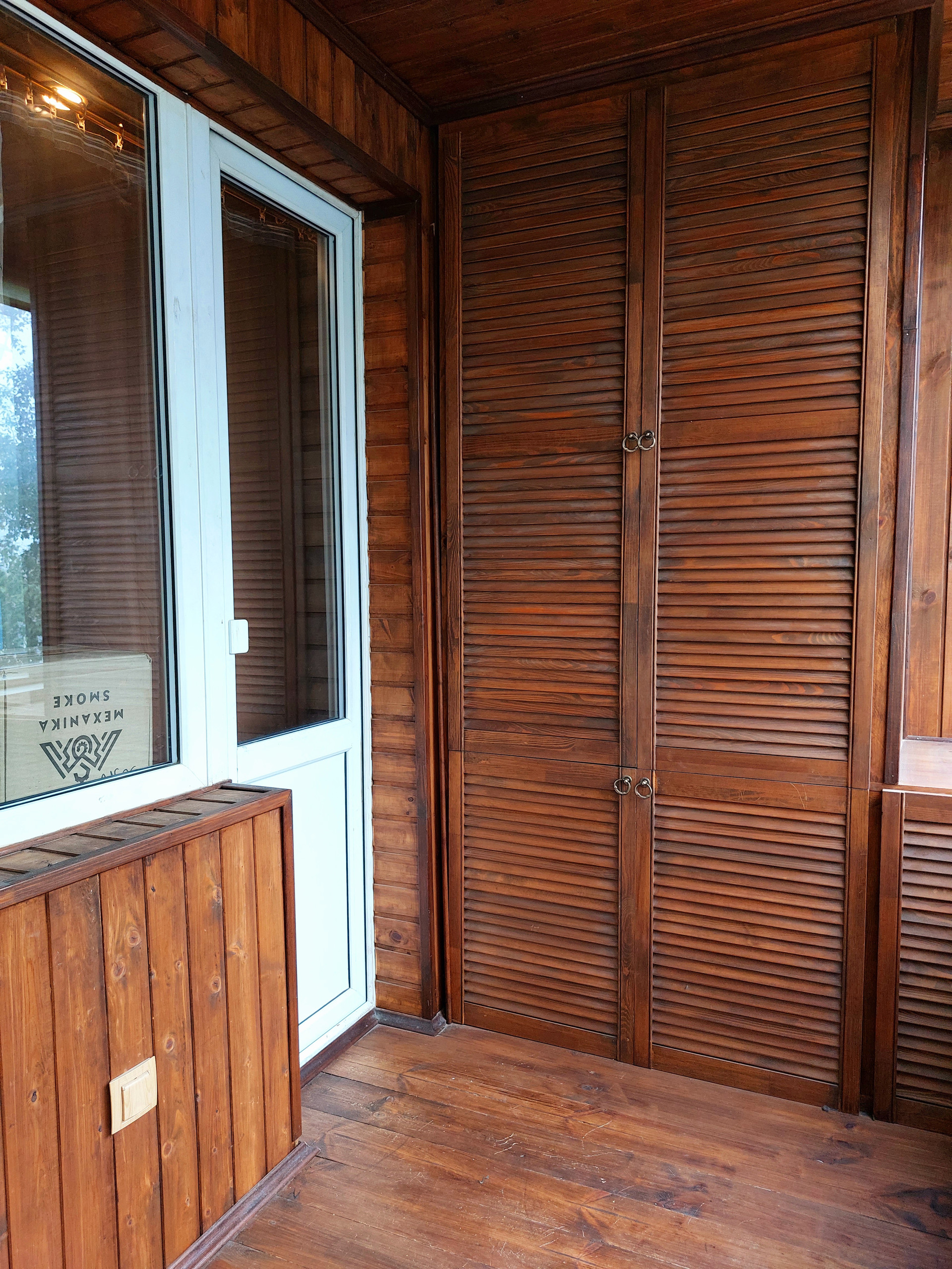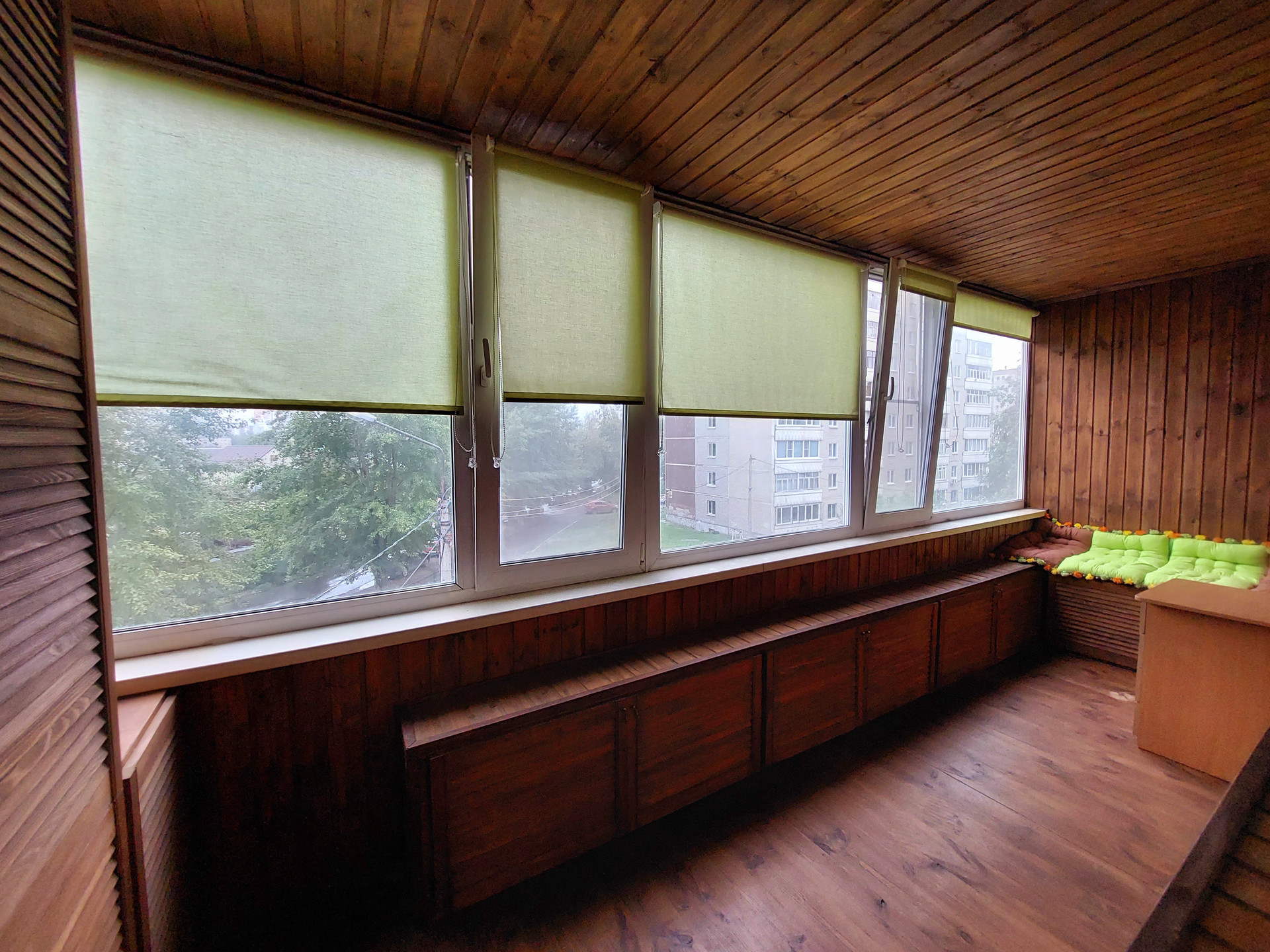 В квартире благоустроенная большая утепленная лоджия вдоль гостиной и кухни: пластиковые стеклопакеты, деревянный пол, шкафы, отделка деревом. На балконе есть дополнительная розетка. Оставляем также в зоне отдыха большую и мягкую подушку, сделанную своими руками и любовью для комфортного времяпрепровождения на лоджии. На балконе на всех окнах установлены рулонные тканевые шторы, что позволяет регулировать степень открытости окон.