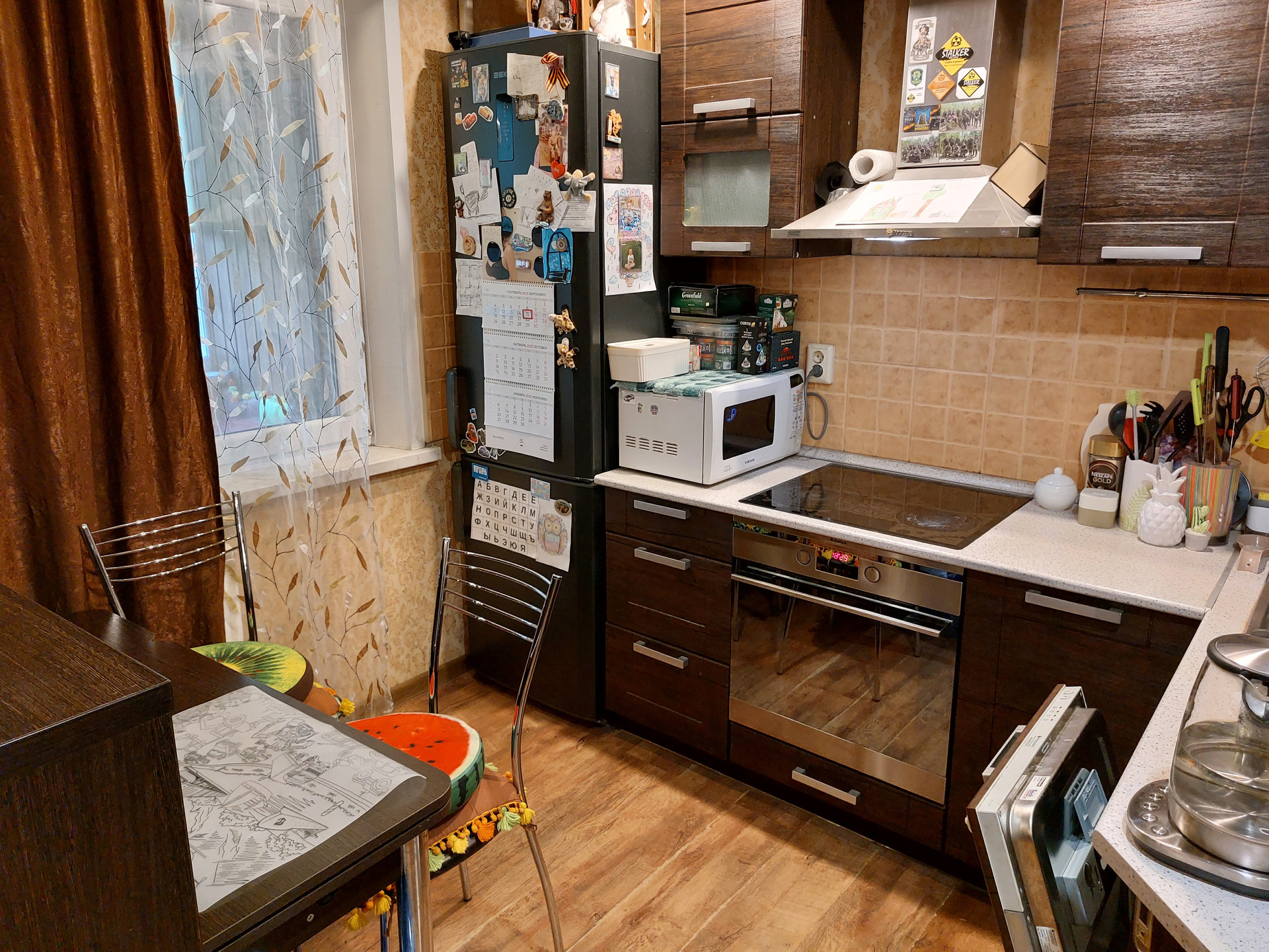 Остается кухонный гарнитур со встроенное бытовой техникой - духовой шкаф и варочная поверхность, а также вытяжка и посудомоечная машина. Все исправно и отлично функционирует.