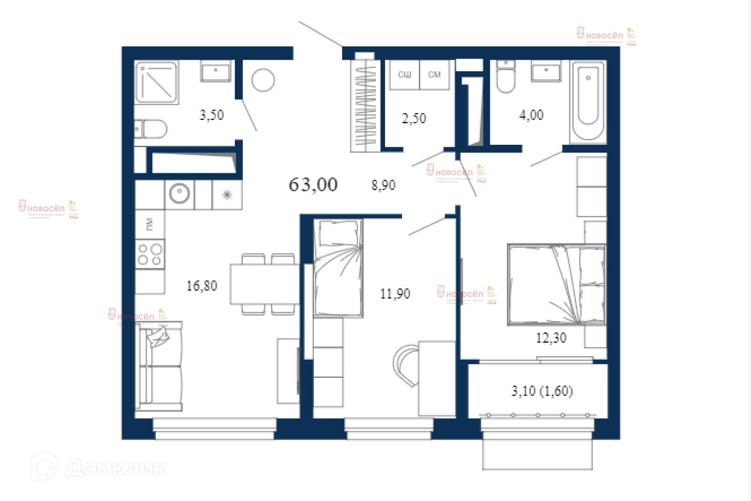 Общая площадь 63 м2