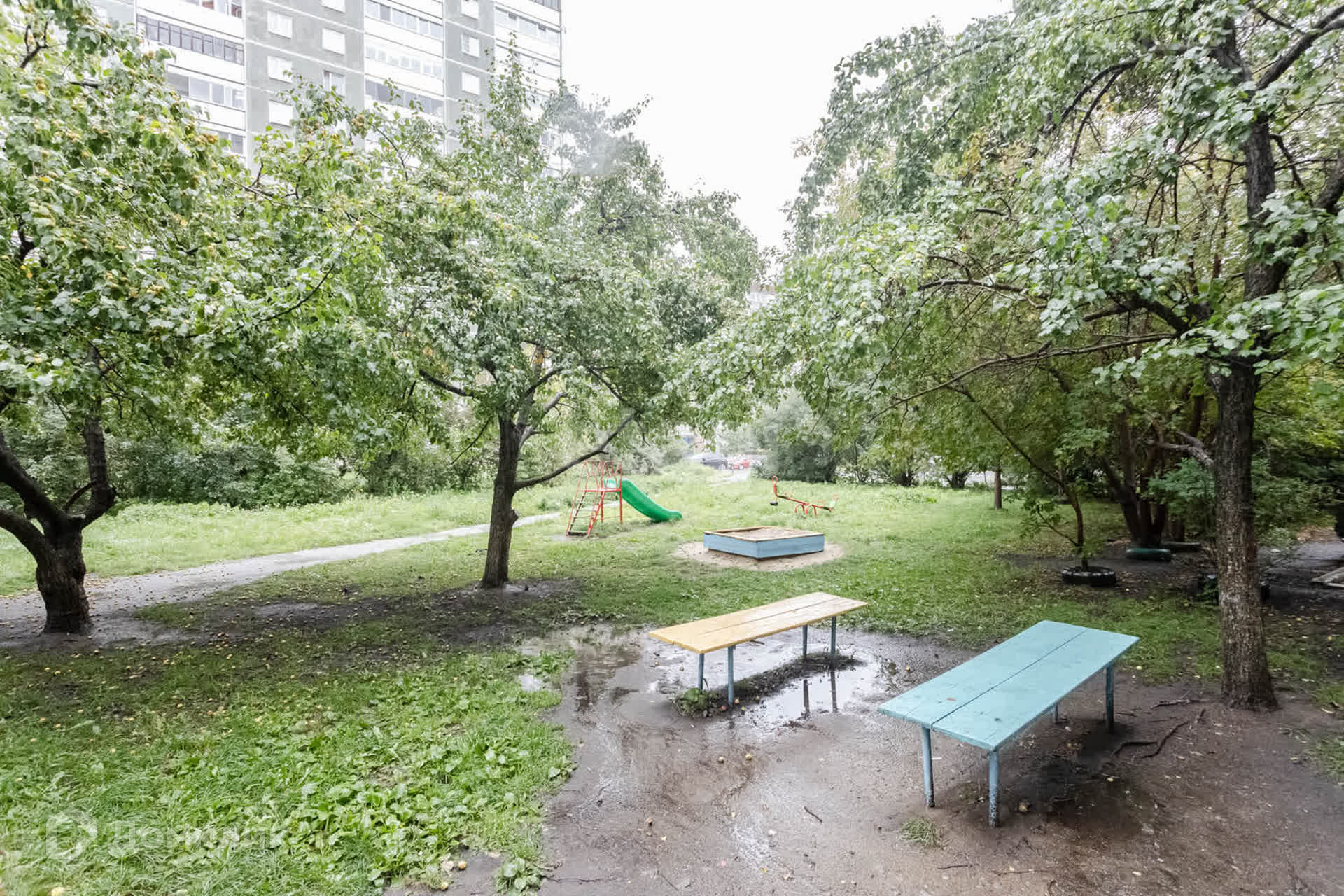 Двор тихий и уютный, оборудованный скамейками и детской площадкой.