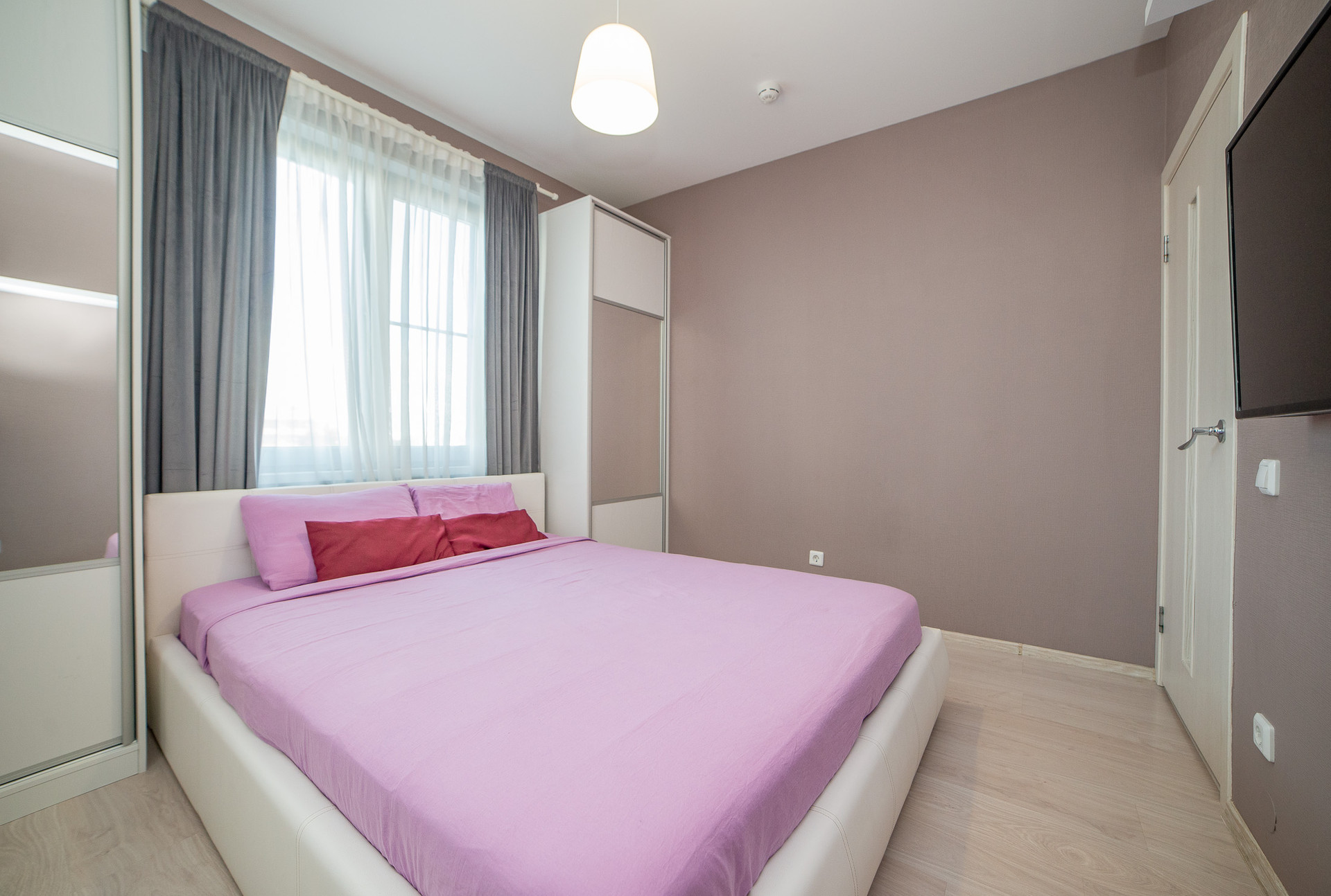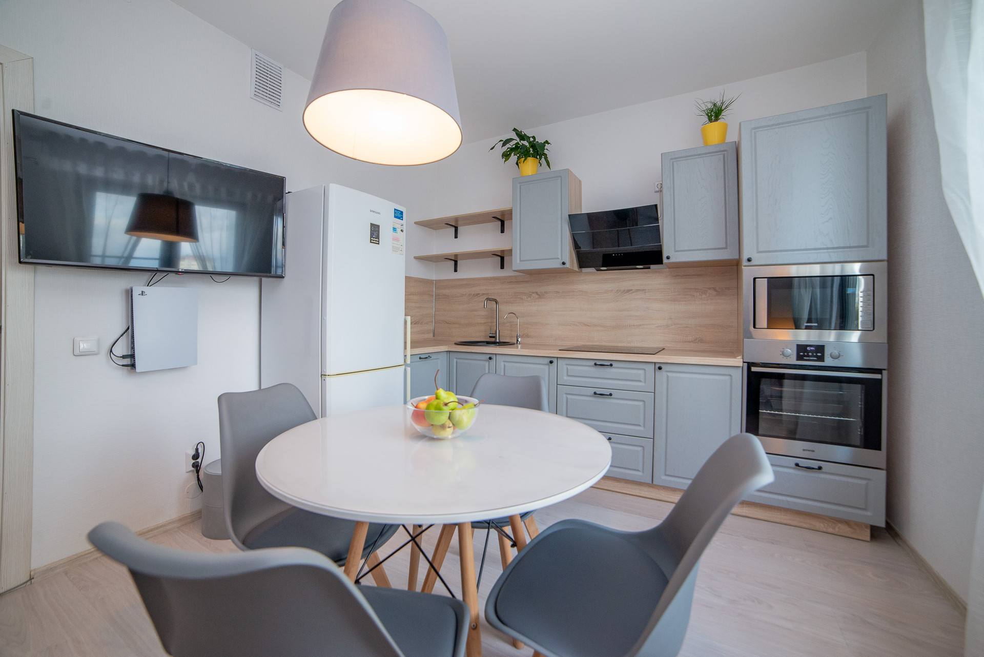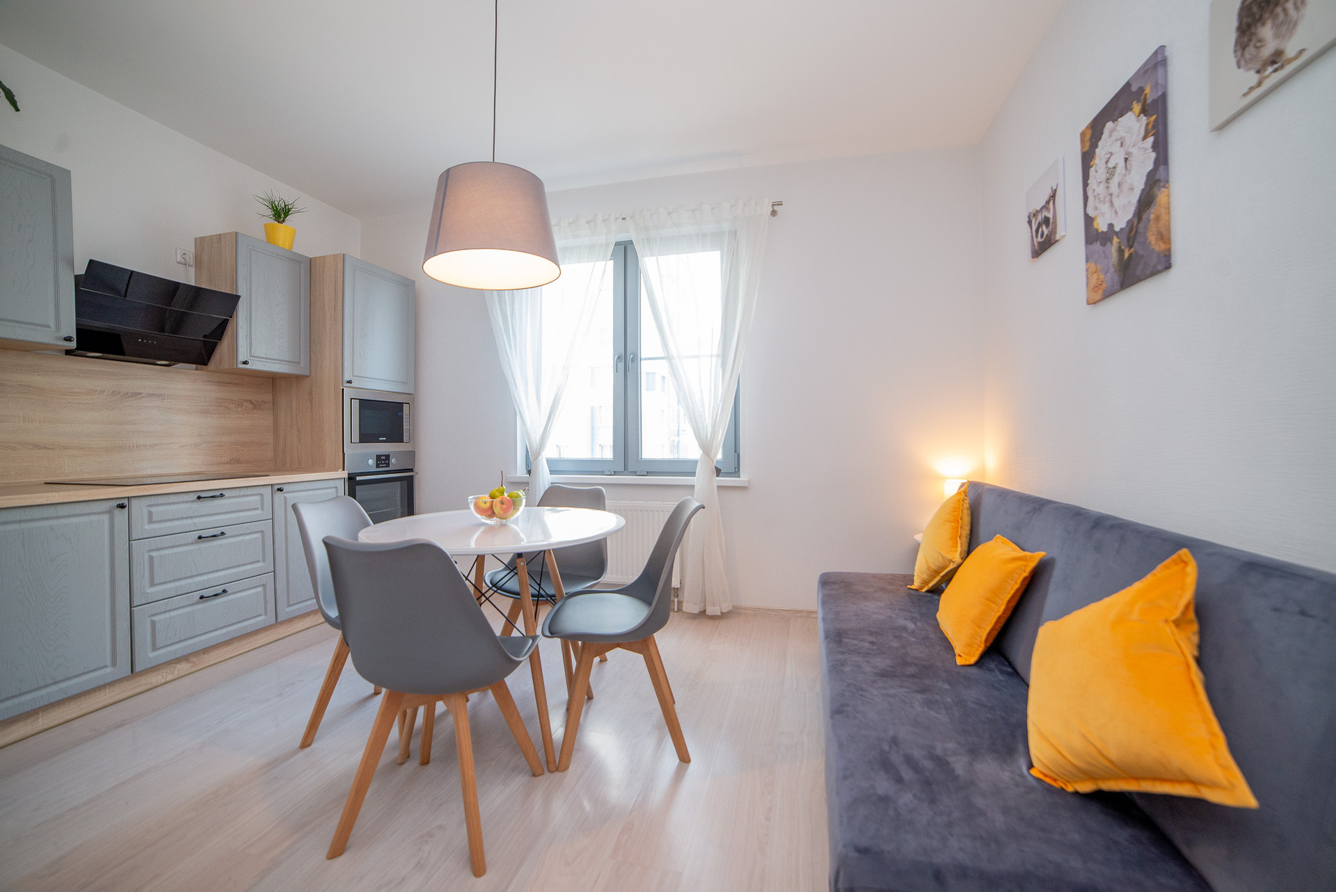 Красивая  кухня - гостиная, спальня в приятных цветах, яркая детская.