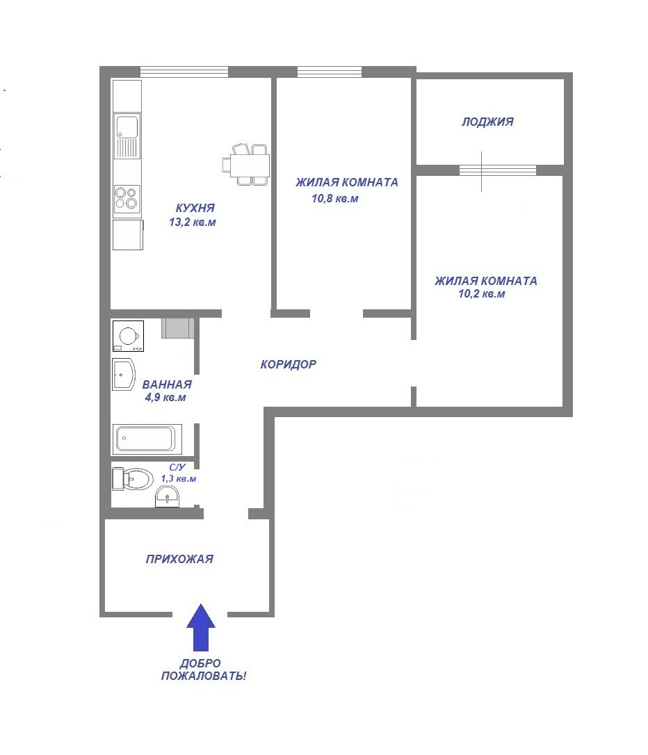 Общая площадь - 55 м2