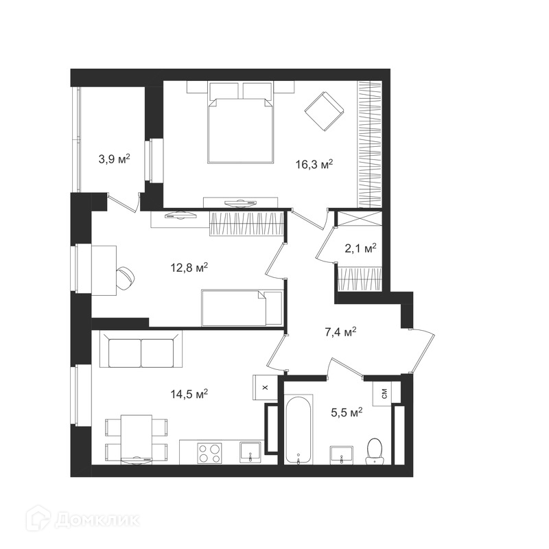 Общая площадь 60.5 м2