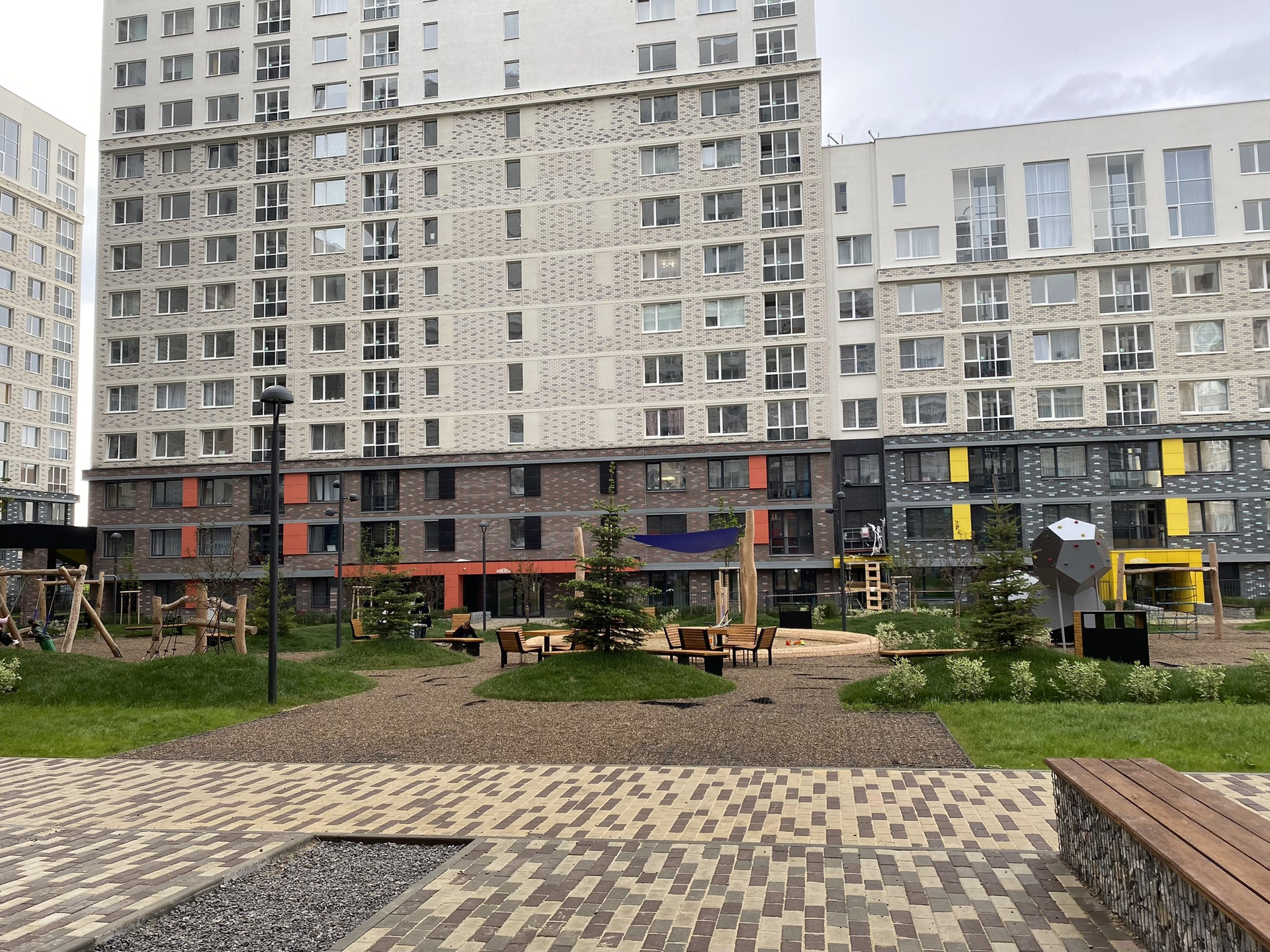 Двор без машин с детскими площадками, зоной для отдыха взрослых и многоуровневым озеленением.