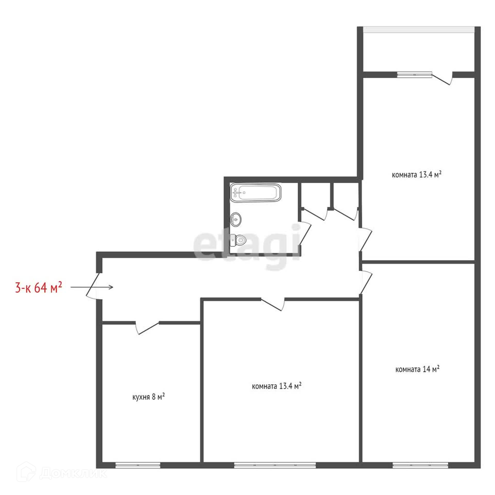 – Общая площадь: 64 квадратных метра.