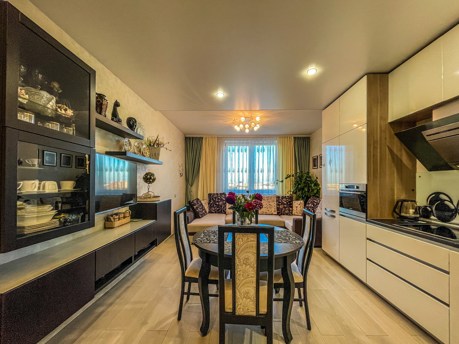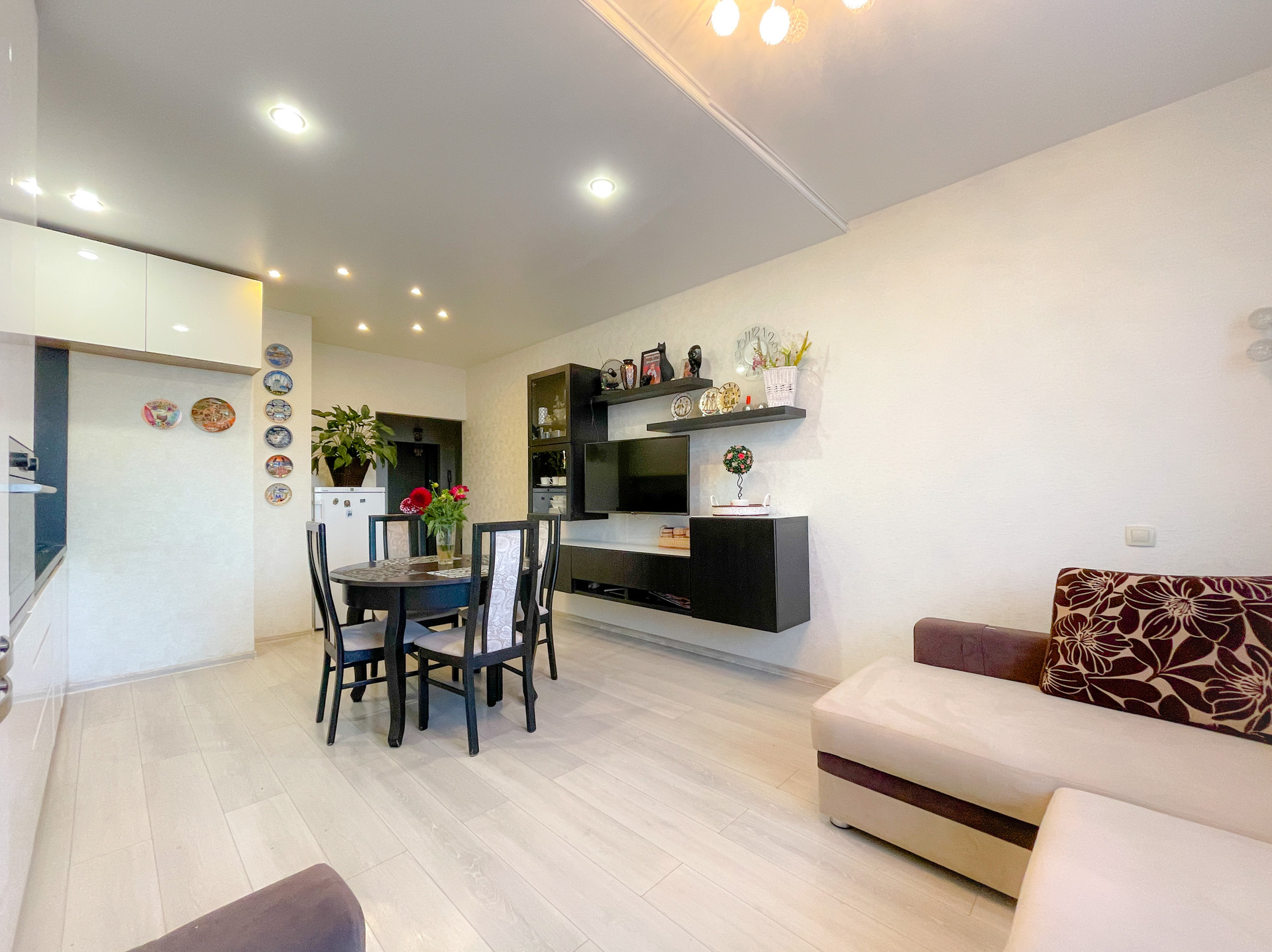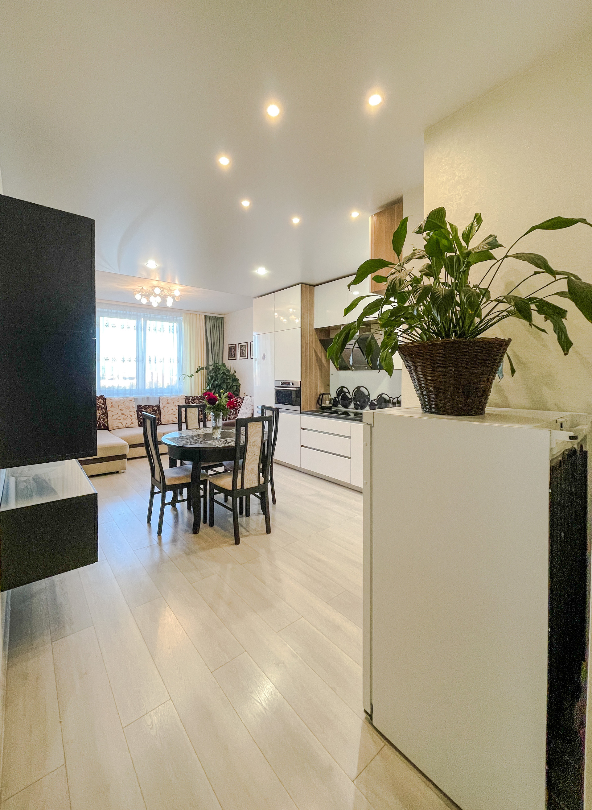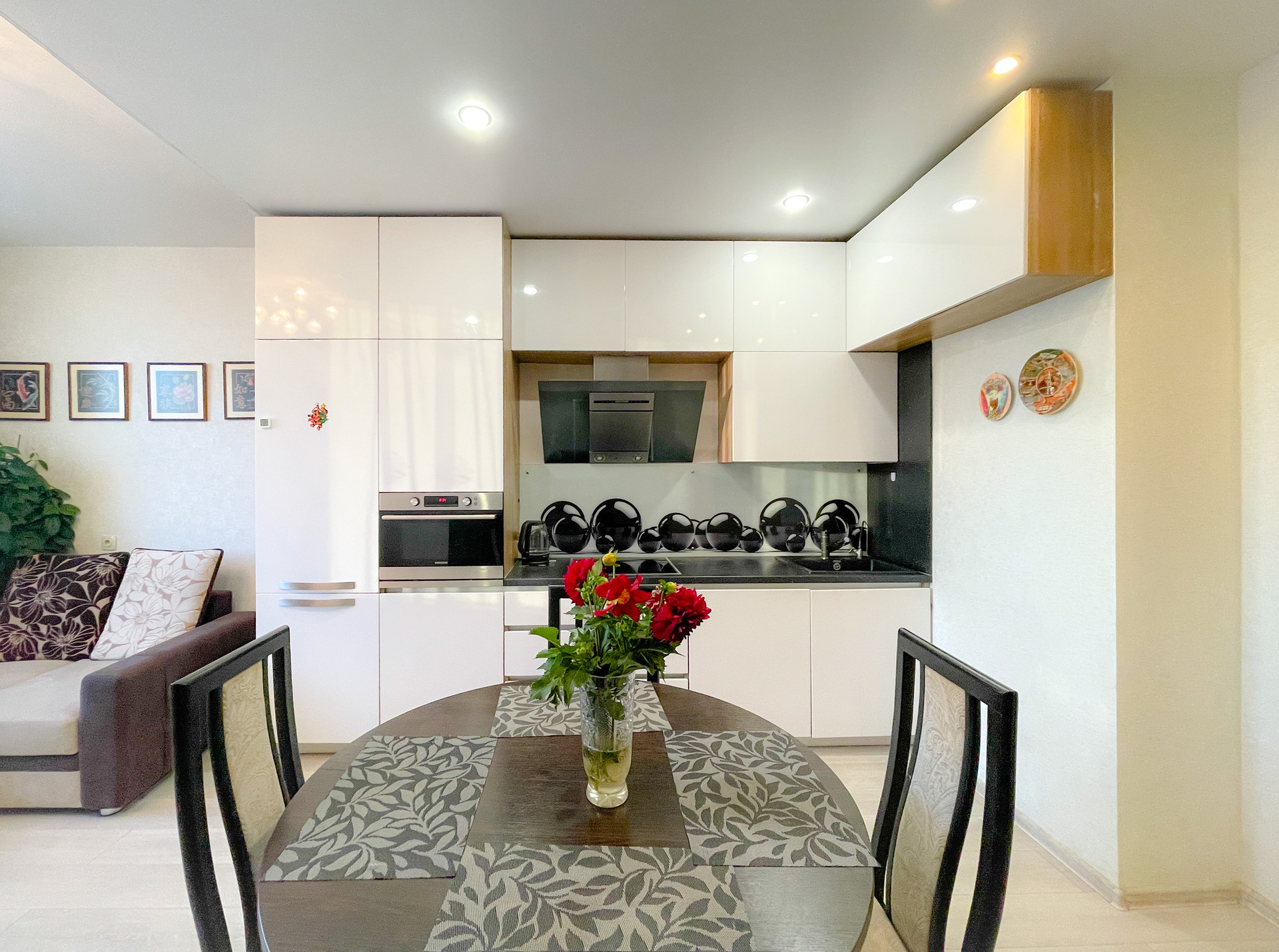 Остается кухонный гарнитур со встроенной техникой: холодильник, духовой шкаф-микроволновка, варочная поверхность.