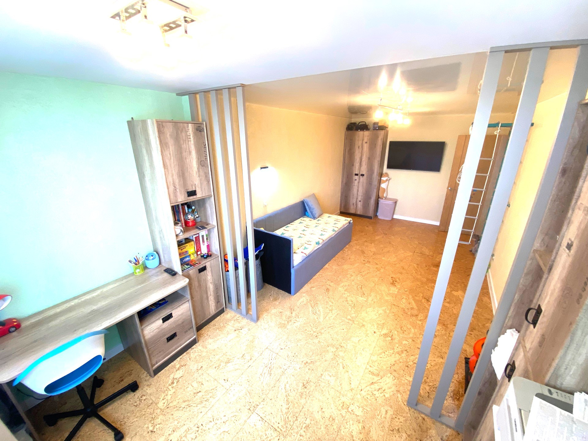 - в зале, коридоре и кухне на полу выложен паркет. В двух оставшихся комнатах установлен пробковый пол.