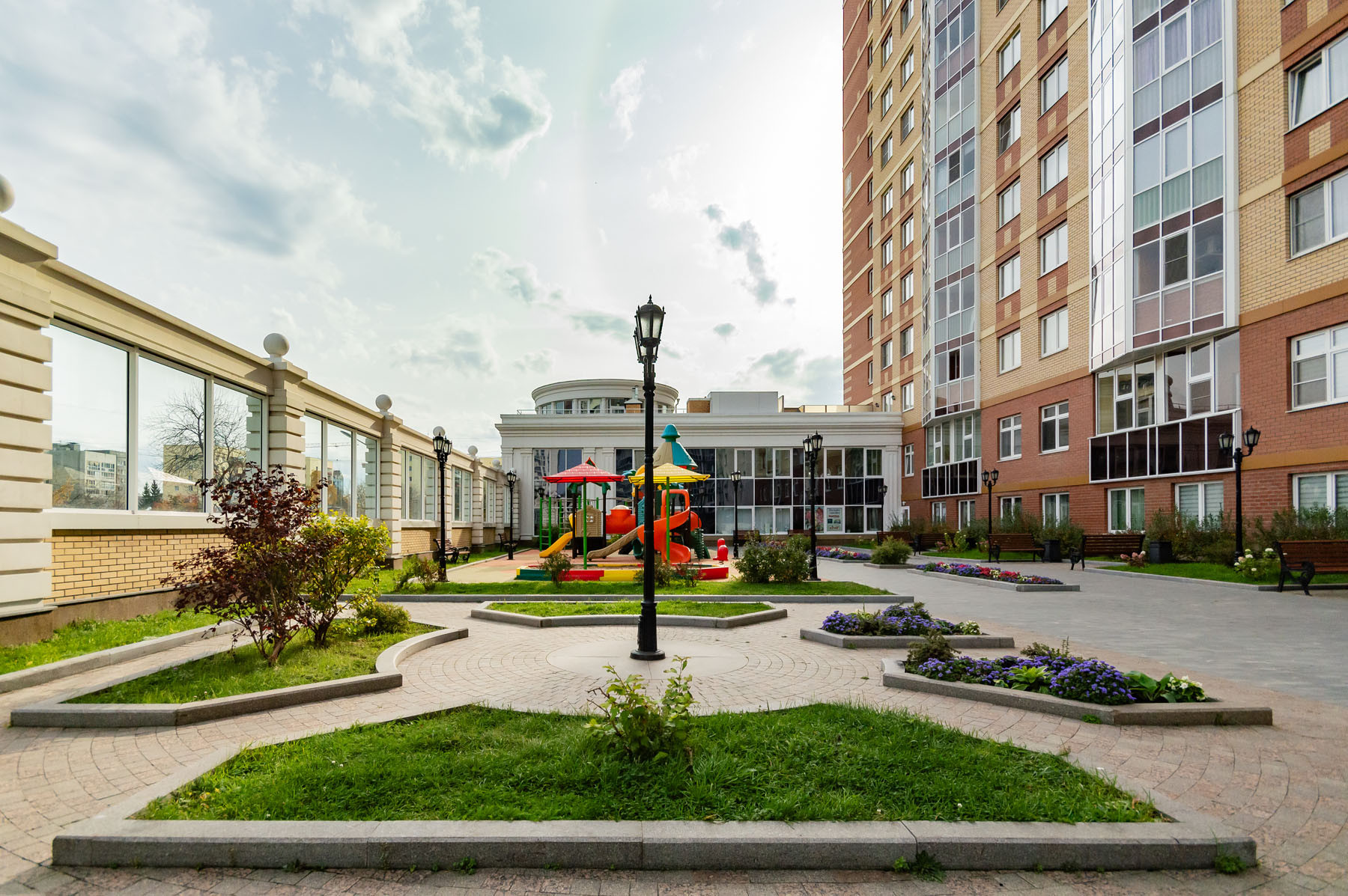 - полностью закрытая территория дворовой части, расположенная на уровне второго этажа (детская площадка с прорезиненным покрытием);