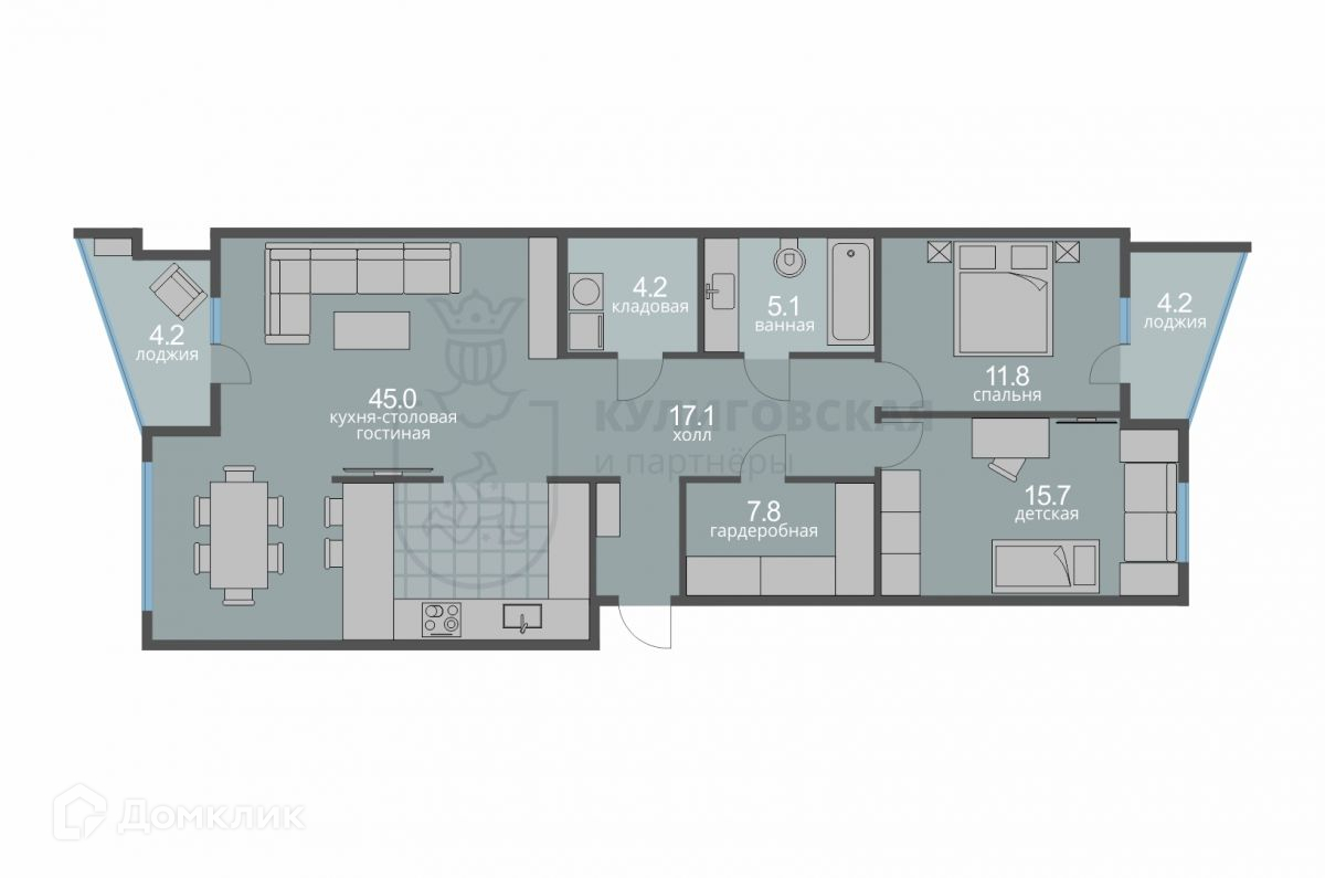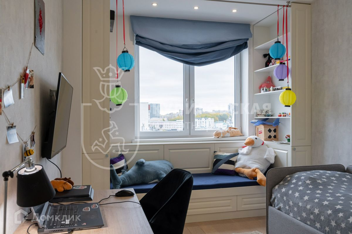 В просторной прихожей 2 больших встроенных шкафа. Кухня разделена с гостиной изящной перегородкой, что визуально делает пространство больше и воздушнее. В хозяйственной комнате установлены стиральная машина, водонагреватель, поэтому в квартире всегда будет горячая вода. В гардеробной комнате многофункциональная система хранения. Из спальни выход на лоджию с панорамным остеклением, где при желании можно будет организовать рабочее место или зону для отдыха. В детской комнате есть необходимая мебель, она подойдет как для мальчика, так и для девочки, так как оформлена в нейтральном цвете. В квартире установлен кондиционер.