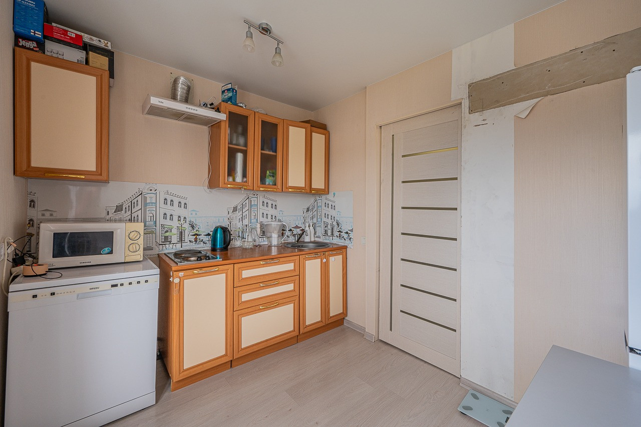О КВАРТИРЕ: просторная однокомнатная квартира, общая площадь 34,5 кв. метров, площадь комнаты 19 кв. метра, площадь кухни 6,9 кв. метра, есть большая застекленная лоджия около 8 кв. метров. Квартира расположена на 12 этаже 12 этажного дома. Квартира теплая, установлены пластиковые окна, на стенах обои, на полу ламинат, потолок натяжной, установлены новые межкомнатные двери, а также входная дверь. В коридоре остается встроенный шкаф купе. Счетчики на воду, электроэнергию, установлены. Коммунальные платежи составляют 4 500 руб.