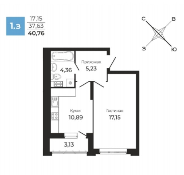Общая площадь 40.76 м2