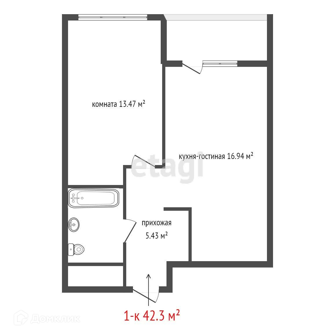 Общая площадь 42.3 м2