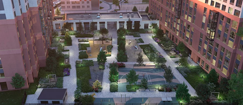 Закрытый двор без машин, чтобы не переживать за ребенка. Двор - частная территория, скрытая от посторонних глаз. наземный паркинг с видеонаблюдением.