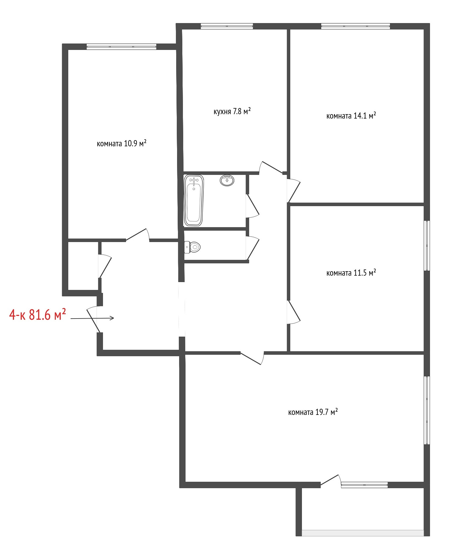 - Все 4 комнаты изолированные, окна выходят на 3 стороны.
