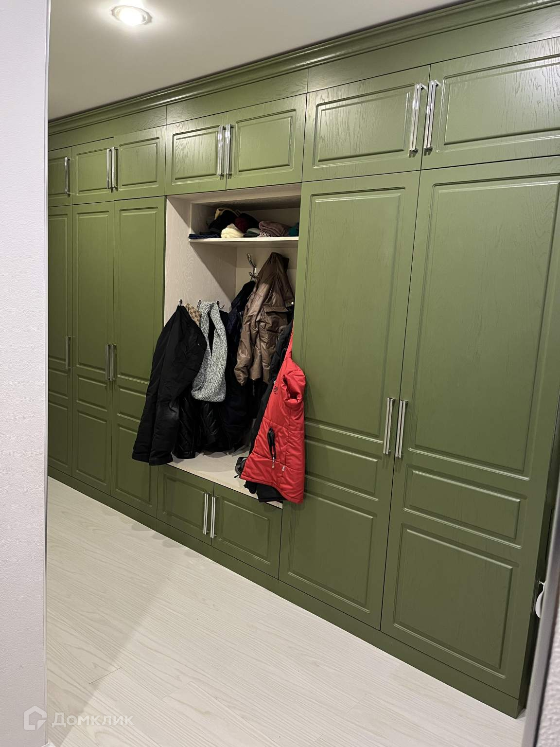 Холл/коридор 15,6м2 со встроенной прихожей 4,5 метра в длину, зеркальное панно, банкетка.