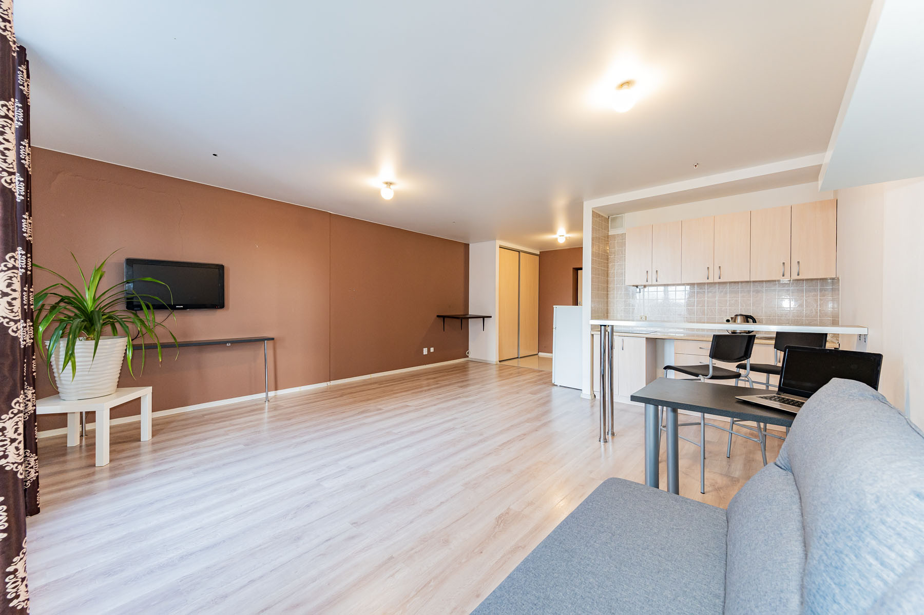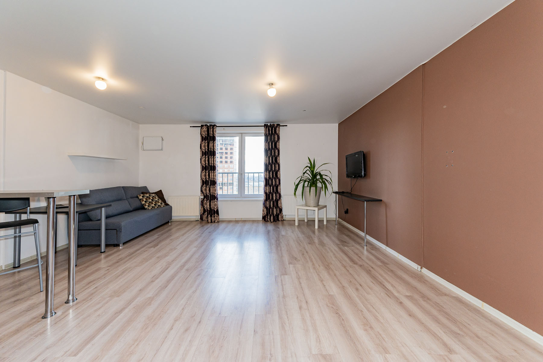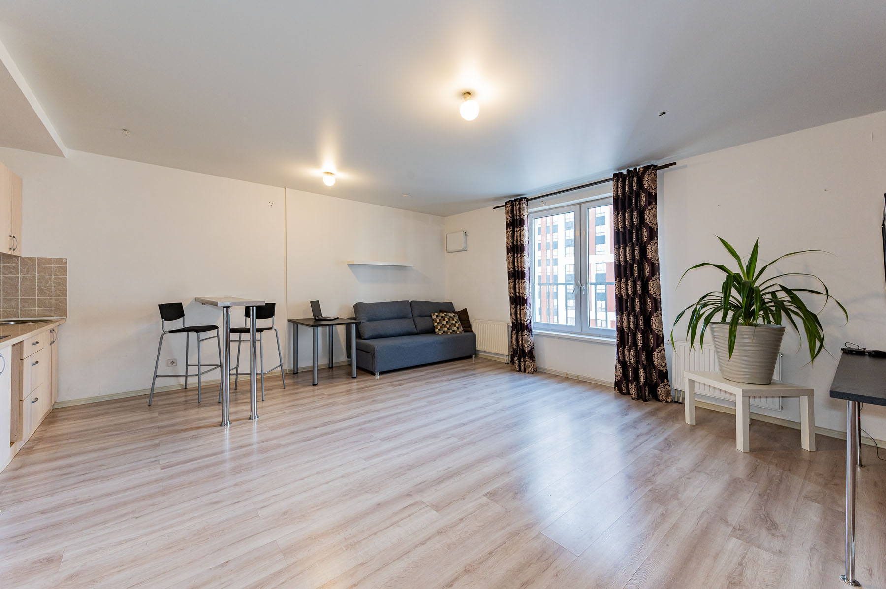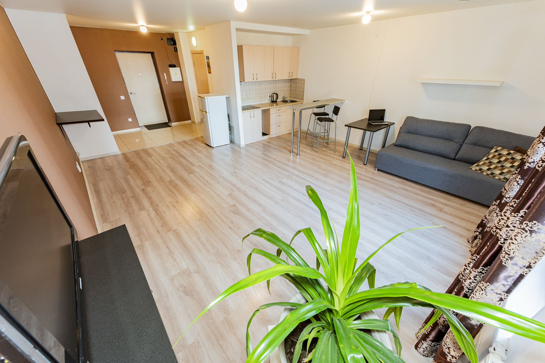 Апартаменты по планировке - это просторная студия. В отличном состоянии. Сделан ремонт: натяжной потолок, ламинат, в ванной комнате выложена плитка.