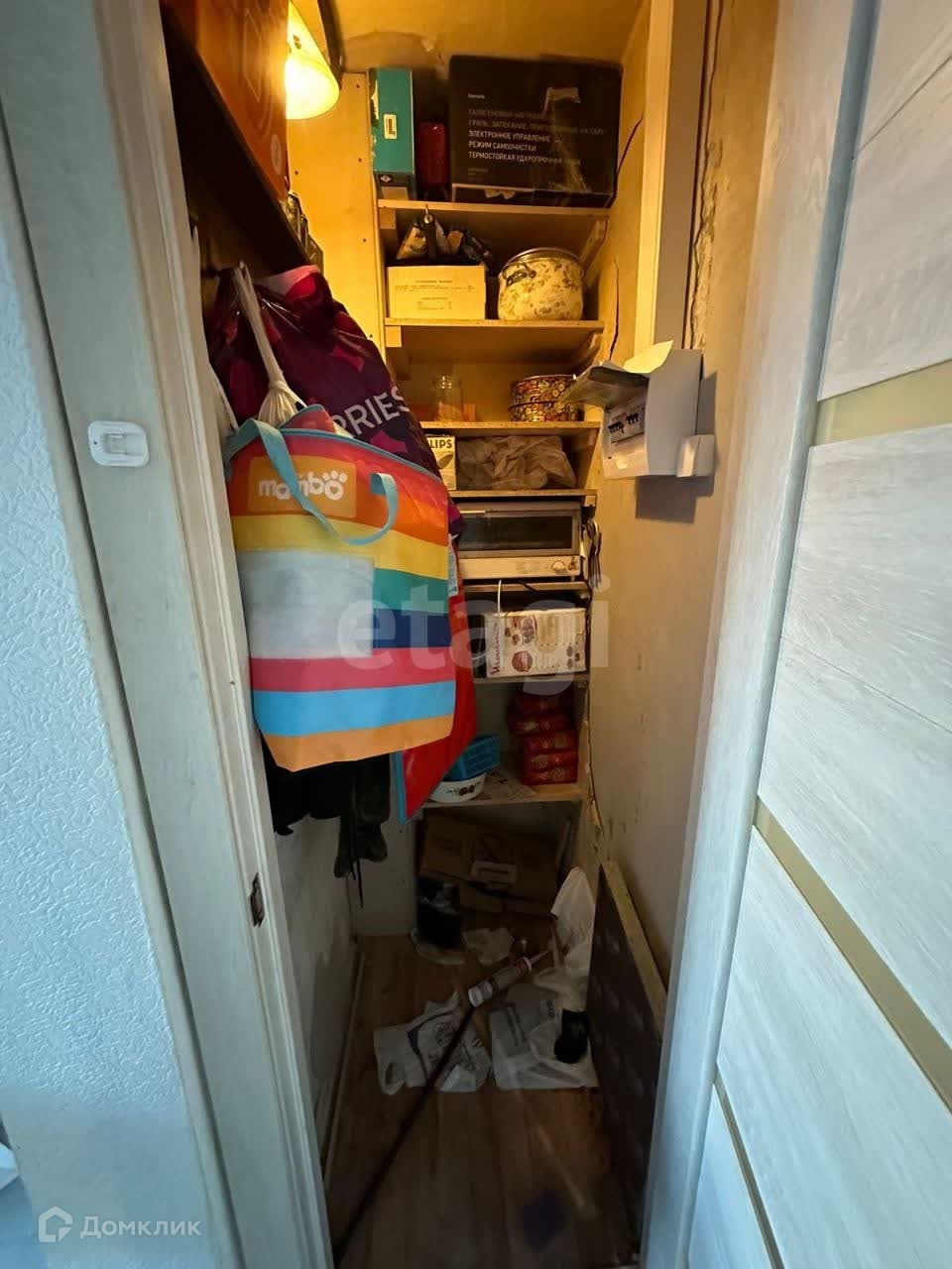 В кладовой находится личный щиток от квартиры с системой узо. Полки для хранения и вешалки для одежды.