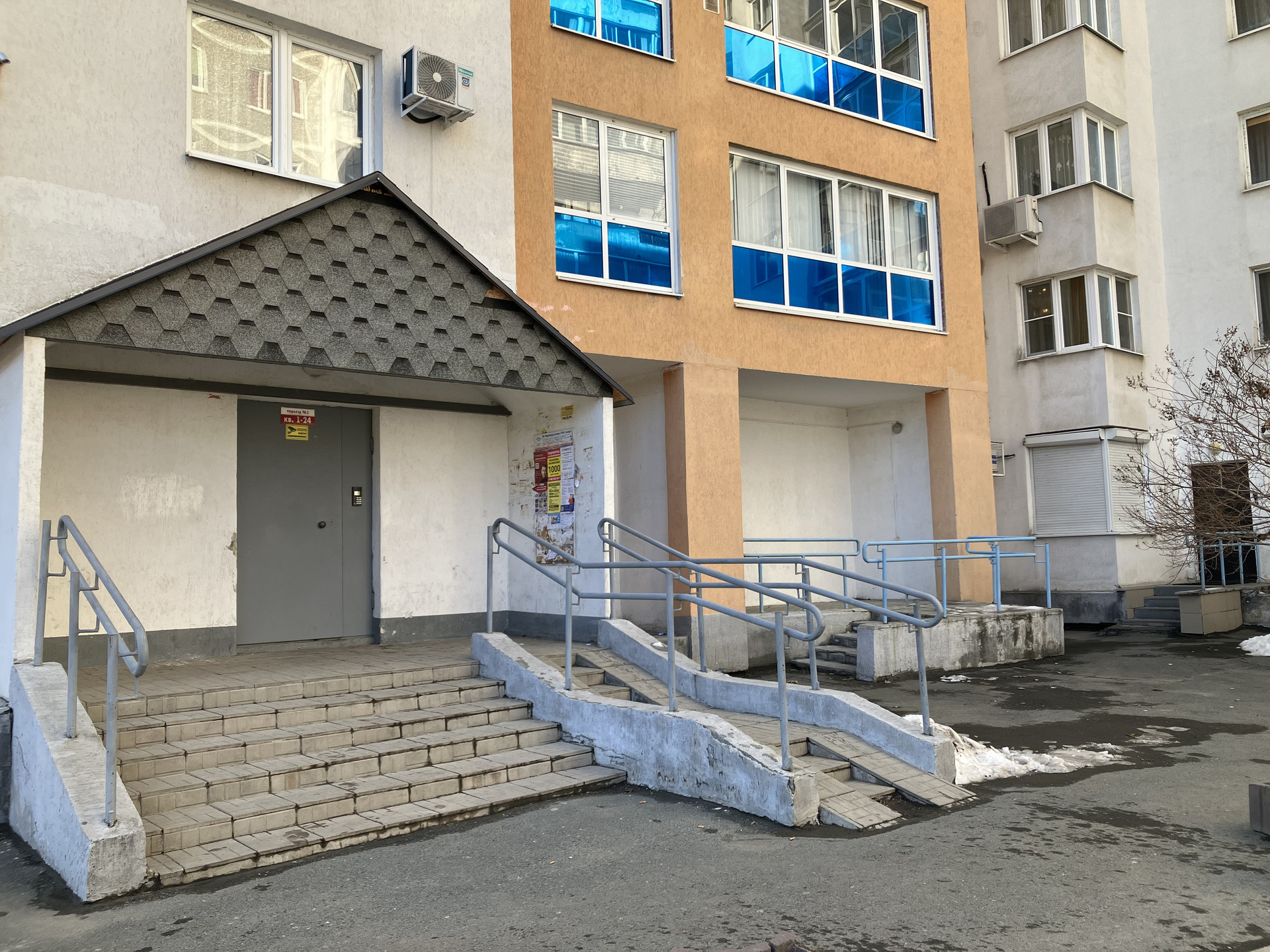 В доме просторный холл, большой грузопассажирский лифт, установлено видеонаблюдение, ухоженный двор, имеется охраняемая парковка.