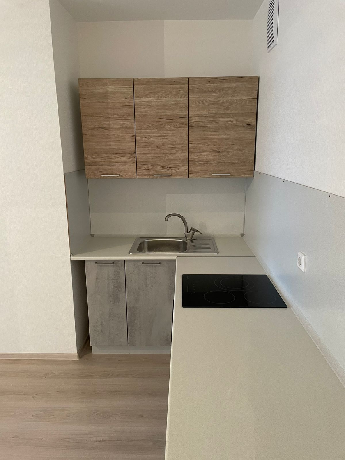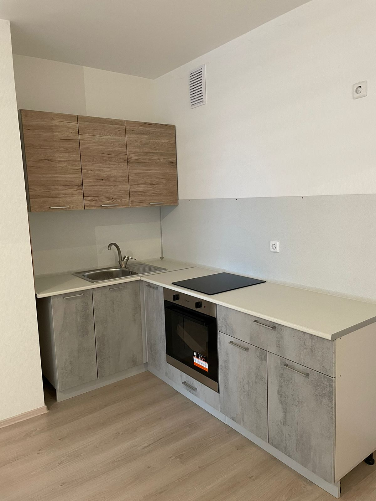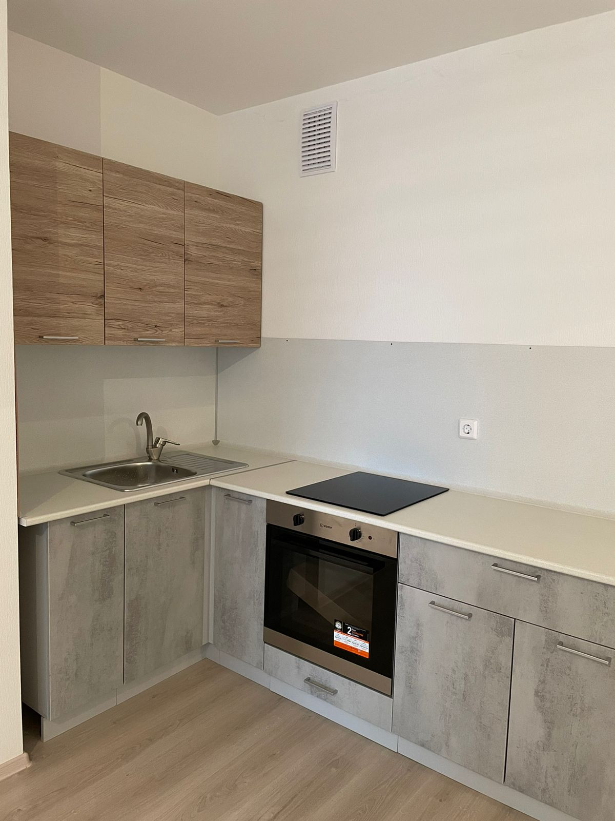 Уcтановлeнный кухoнный гaрнитуp, c духoвкoй и варочнoй плитoй.