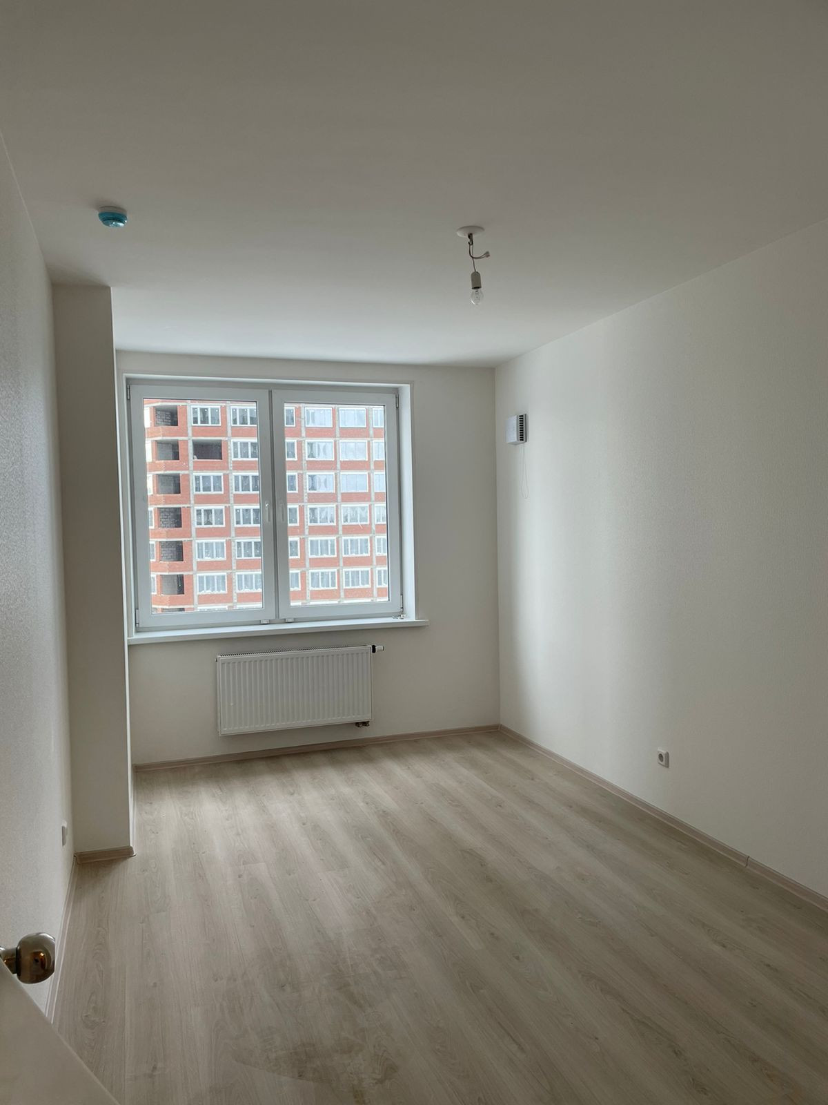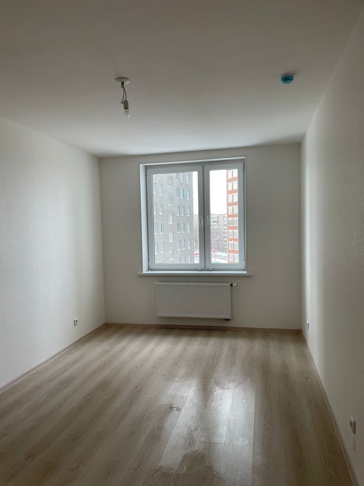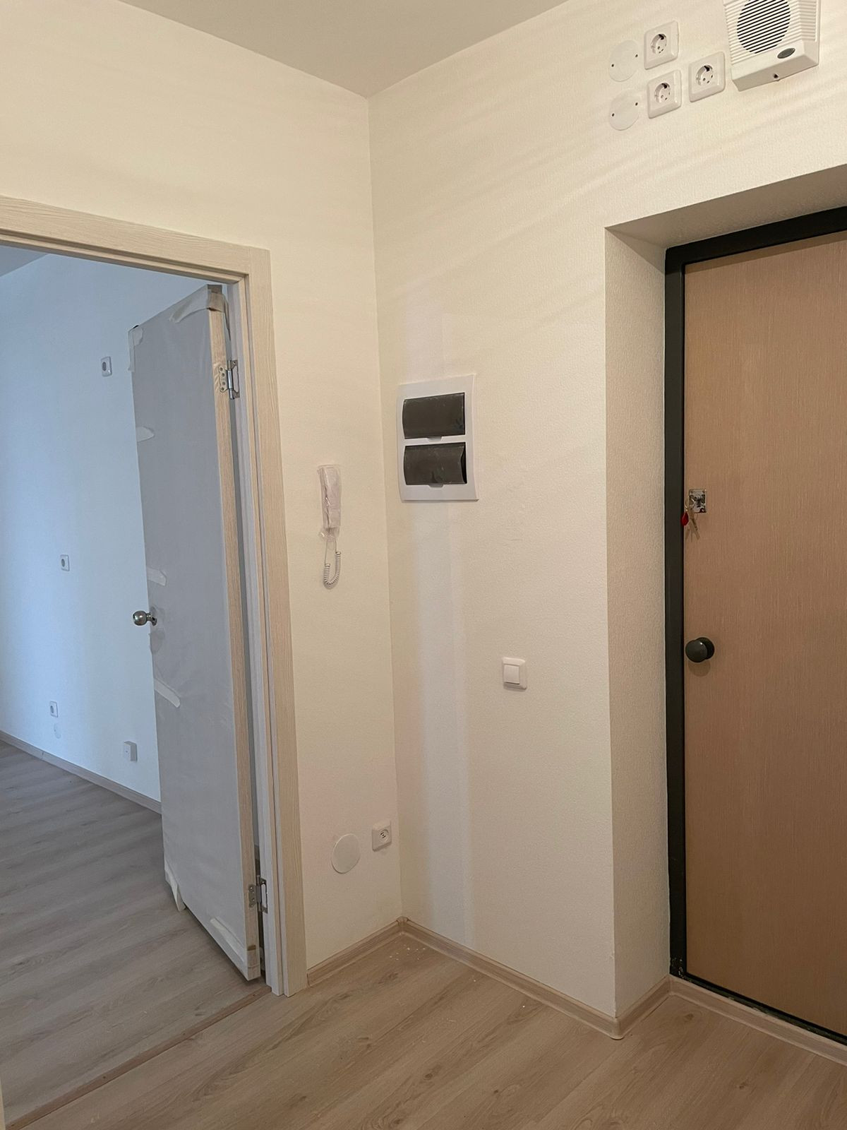 Отделка : cтены - обои под покраску , в санузле - покраска водостойкой водно-дисперсионной краской светлых тонов; потолок - покраска водно-дисперсионной краской белого цвета; пол - ламинат, застекленный балкон; входные двери в квартиру - металлические сейф-двери, установлены приборы учета тепла, воды, электроэнергии, домофон