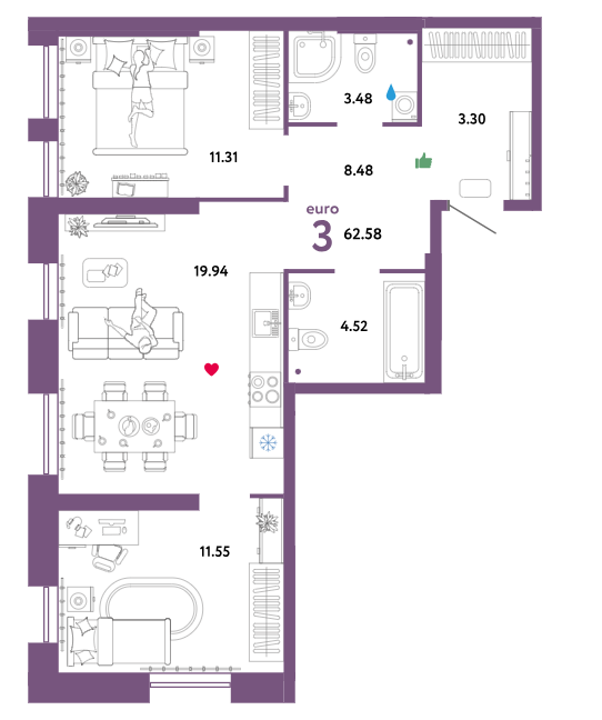 Общая площадь 62.58 м2