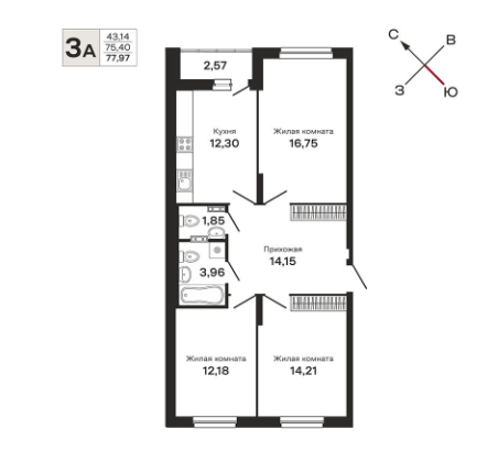 Общая площадь 77.97 м2