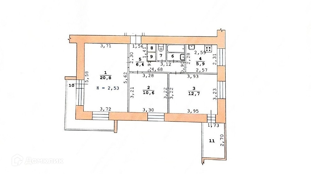 · Планировка редкая и очень удачная: окна выходят на три стороны дома, комнаты все изолированы ( 20+13+11 кв.м.) ,кухня квадратной формы, удобная прихожая ; санузлы раздельные, все коммуникации новые, отдельная проводка на кухню.