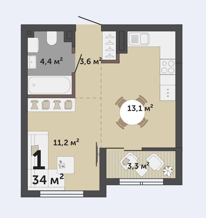 Общая площадь 34 м2