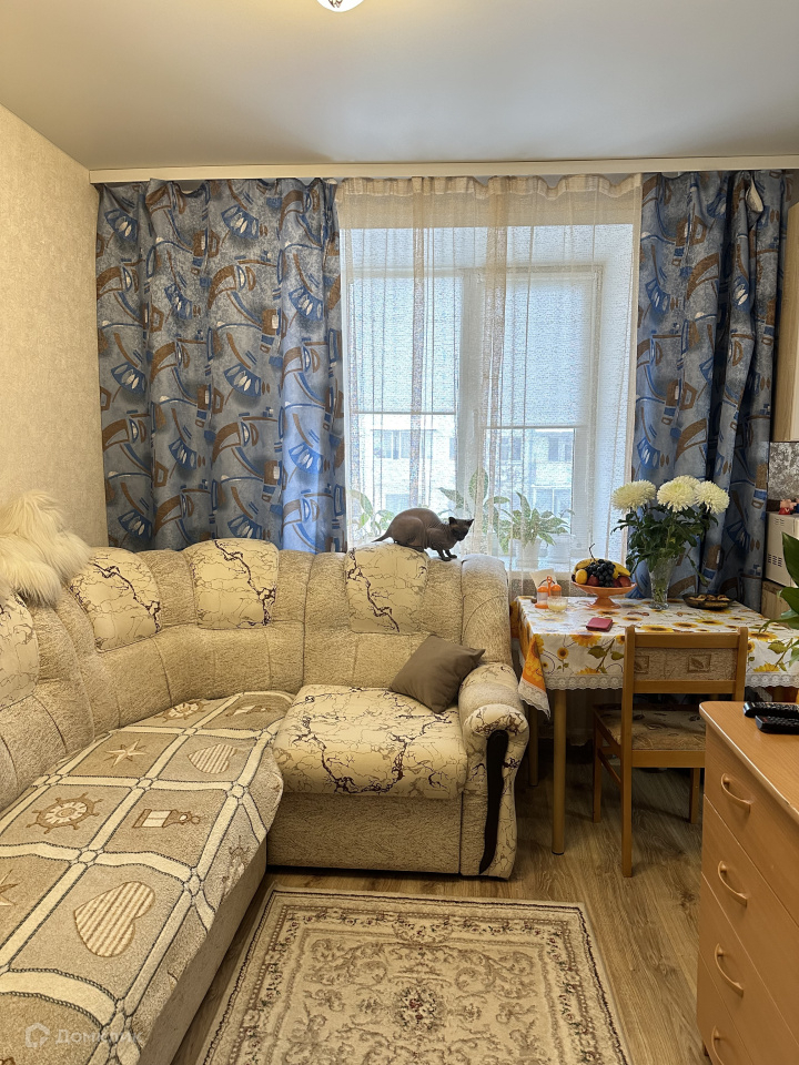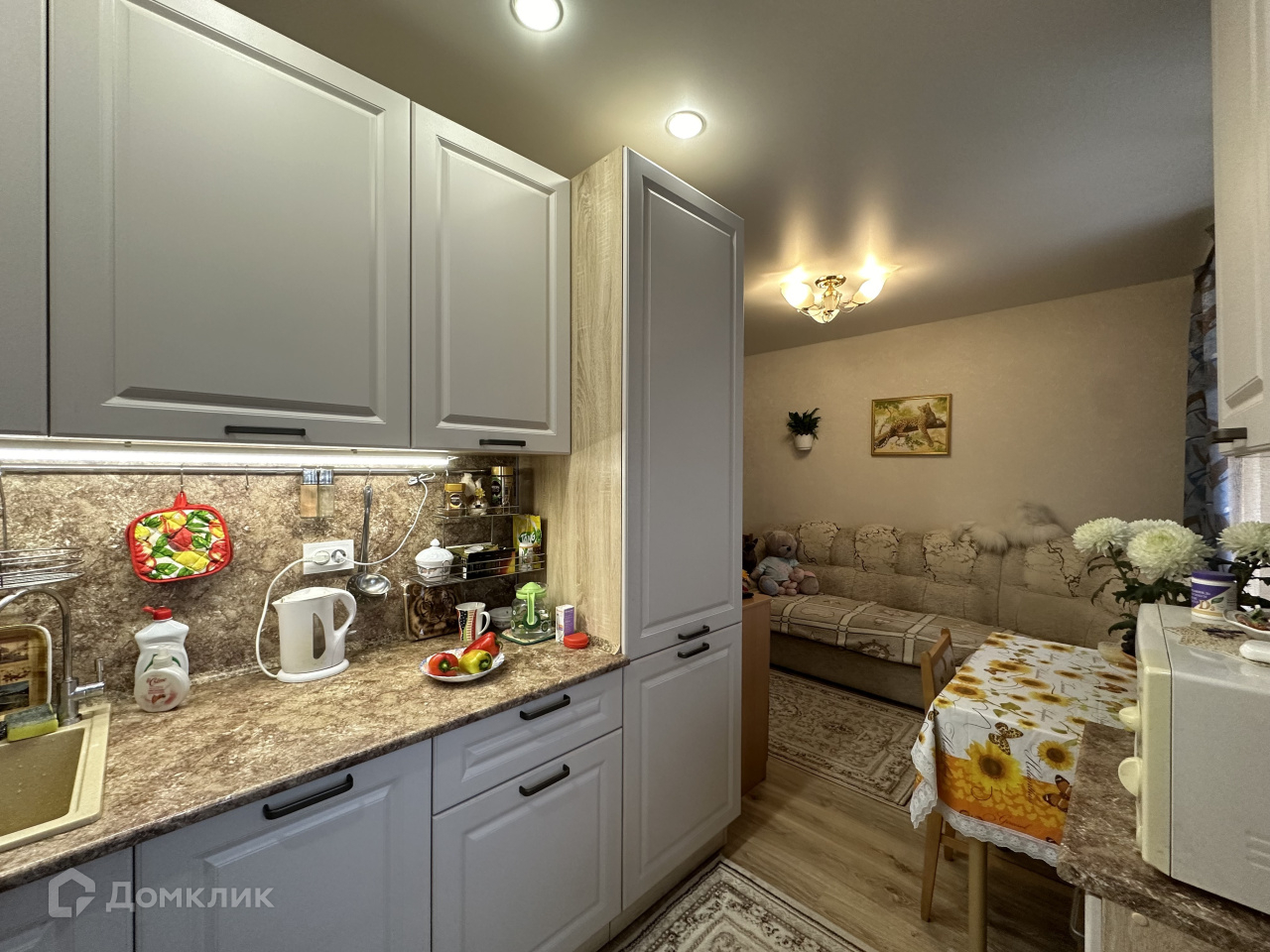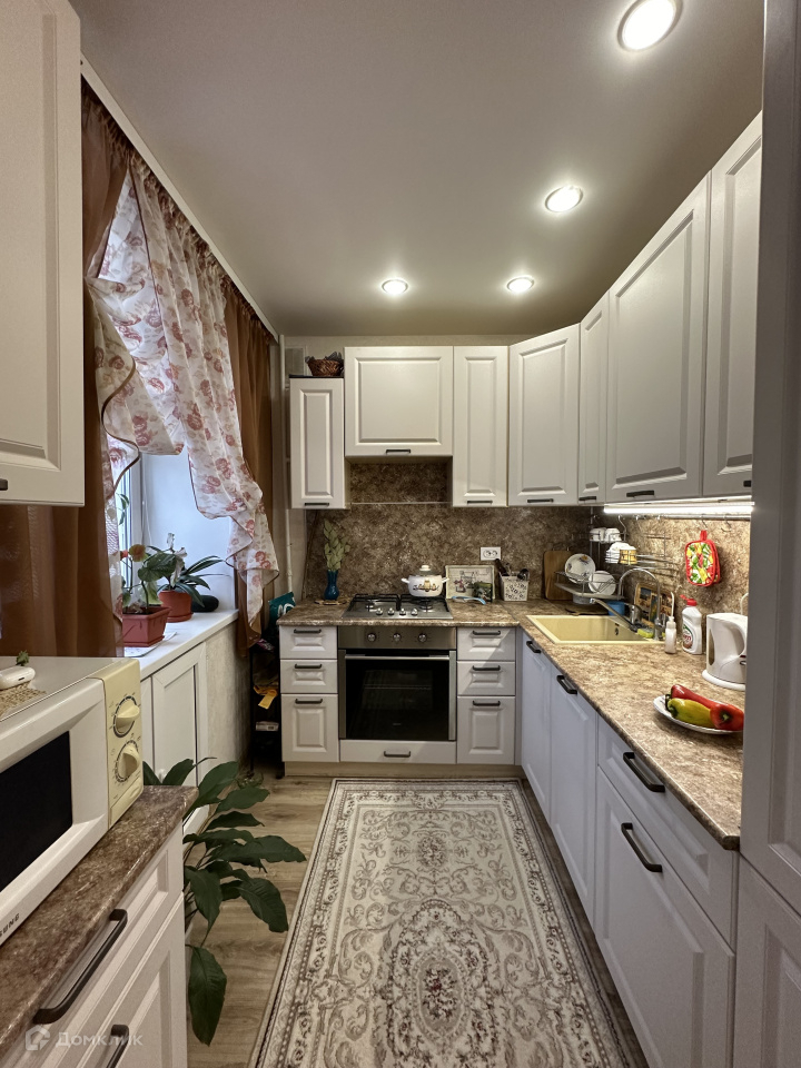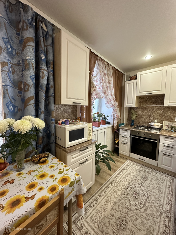 Покупателю остается кухонный гарнитур со встроенной техникой (холодильник, газовая варочная поверхность, духовой шкаф, посудомоечная машина), жалюзи.