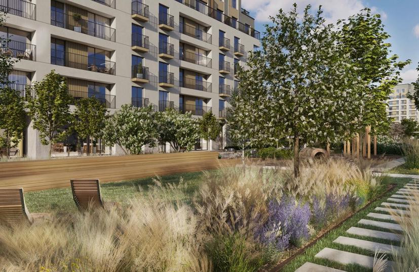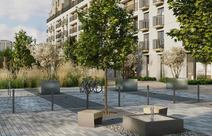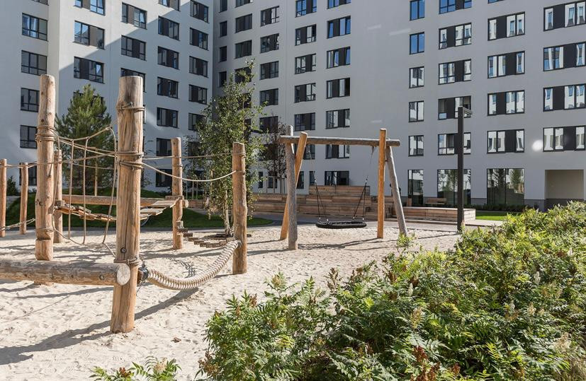 Рядом с домом небольшой сквер, плэйхаб, спортивная площадка, сенсорная тропа и небольшой пруд с детской колонкой. Во дворе дома высажено большое количество деревьев и кустарников. Двор разделён на зоны: детская площадка, места для спорта и тихого отдыха взрослых. Игровые элементы сделаны из дерева: зимой оно не промерзает, а летом не накаляется на солнце.Особенность ландшафта дворов — дождевые сады. Во дворе дома будет установлена многофункциональная беседка с зоной отдыха, небольшой коворкинг и летняя кухня.