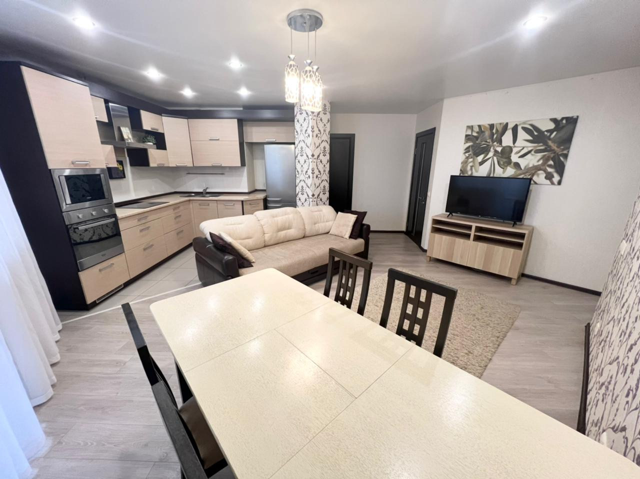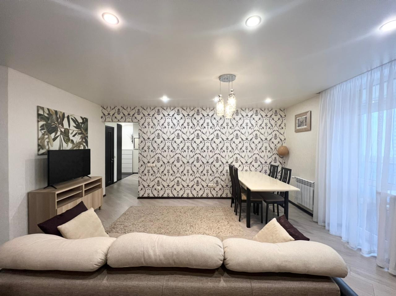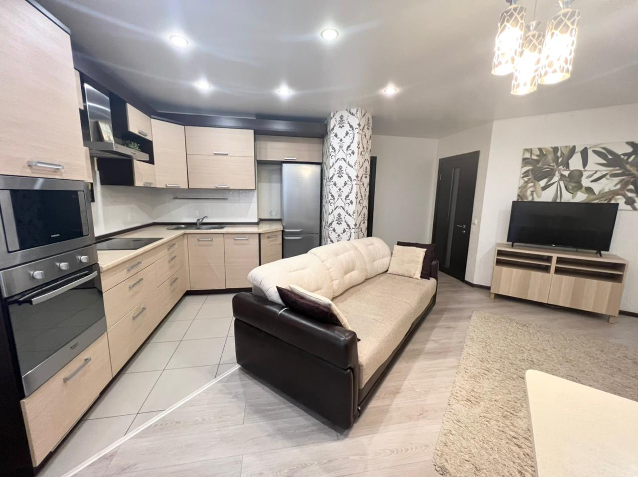 Продаётся уютная трехкомнатная квартира в ЖК "Университетский". Удобная планировка квартиры. Кухня-гостиная 26 кв.м.  и две жилых комнаты - 23 кв.м. и 19 кв.м. Есть отдельная гардеробная комната. Во всей квартире установлены современные радиаторы отопления. Кухонный гарнитур со всей встроенной техникой: духовой шкаф, электрическая плита, вытяжка, микроволновая печь, холодильник, посудомоечная машина. Стол со стульями и  диван. В спальне кровать, тумбы и шкаф-купе. Во второй спальне шкаф, стол со стулом, тумба. В прихожей шкаф-купе. Как говорится заезжай и живи.