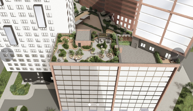 Квартал включает три жилых корпуса переменной этажности – от 17 до 25 этажей и 7-уровневый наземный паркинг, которые объединяет закрытая дворовая территория.