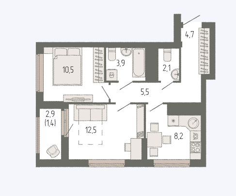 Общая площадь 47.37 м2